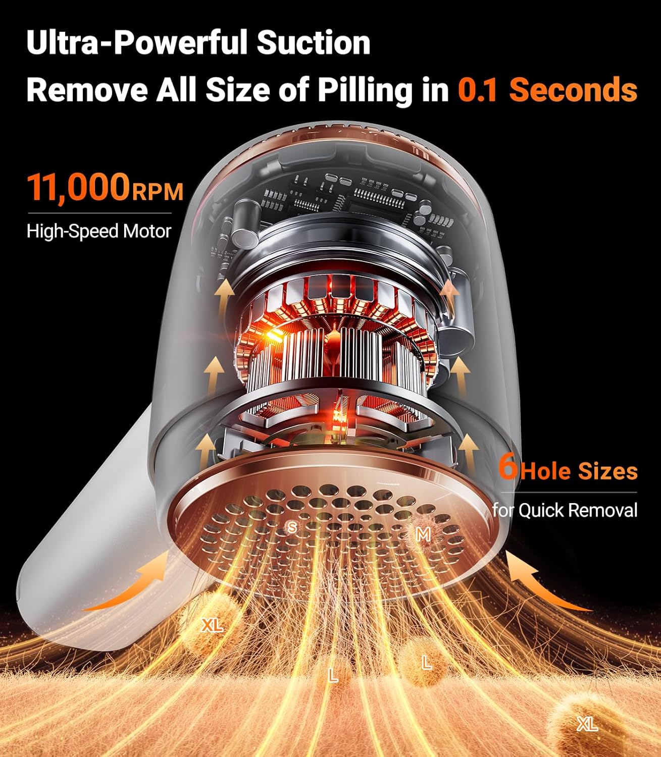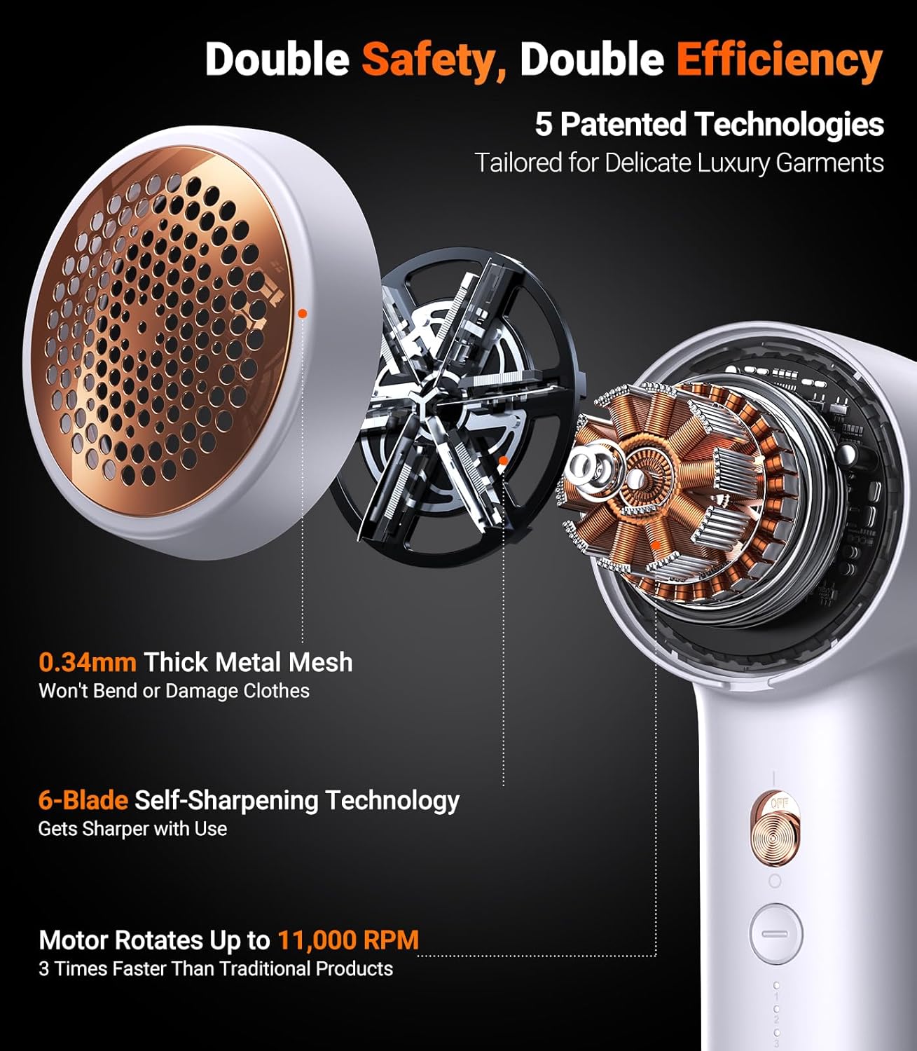 - 🧣 [Triple Safety Protections] Protect your luxury clothing with triple safety protection mode. Once you open the net cover and lint container, the lint shaver rechargeable will automatically cut off the power to ensure the fabric's good condition and your safety. The electric lint remover for clothes maintains a safe distance between fabric and blades with the suck-shave technology, preventing clothing damage. Revitalize the fabrics in your cozy home with a brand new freshness.