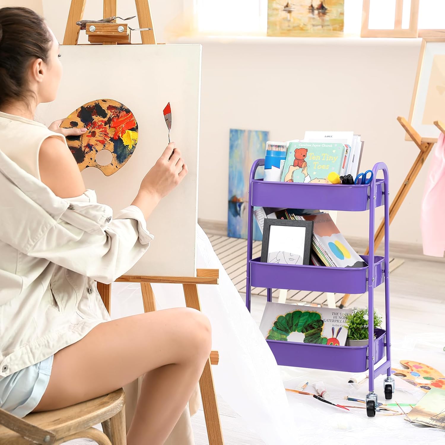 AGTEK Makeup Cart, Movable Rolling Organizer Cart, 3 Tier Metal Utility Cart with Lockable Wheels for Home & Office, Violet