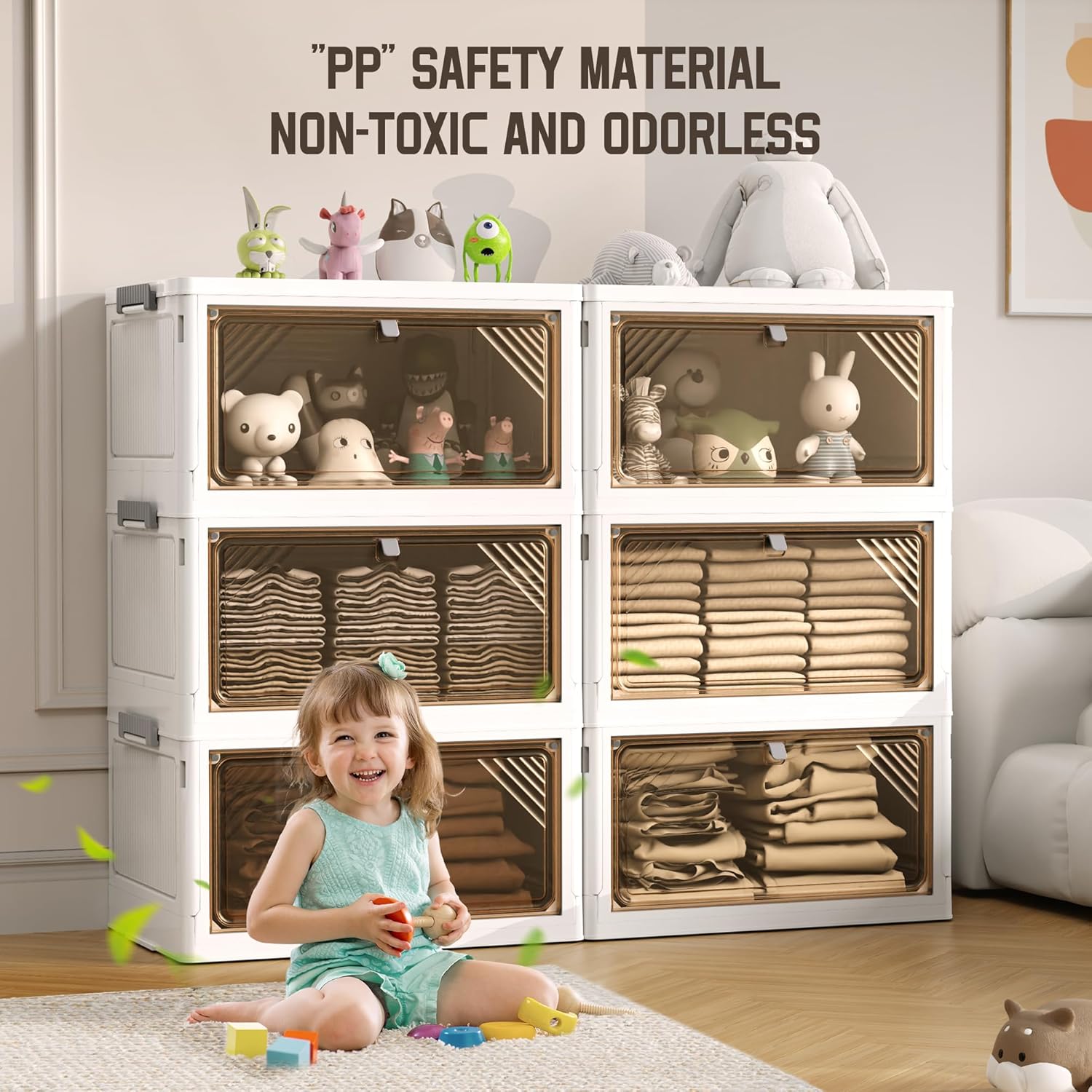 AHEONLAR 144 Quart 3 Tier Plastic Storage Bins with Lid - Foldable Stackable Storage Bins with Doors - Closet Organizers and Storage - Plastic Drawer Storage for Bedroom StudToy Room Office(48QT×3)