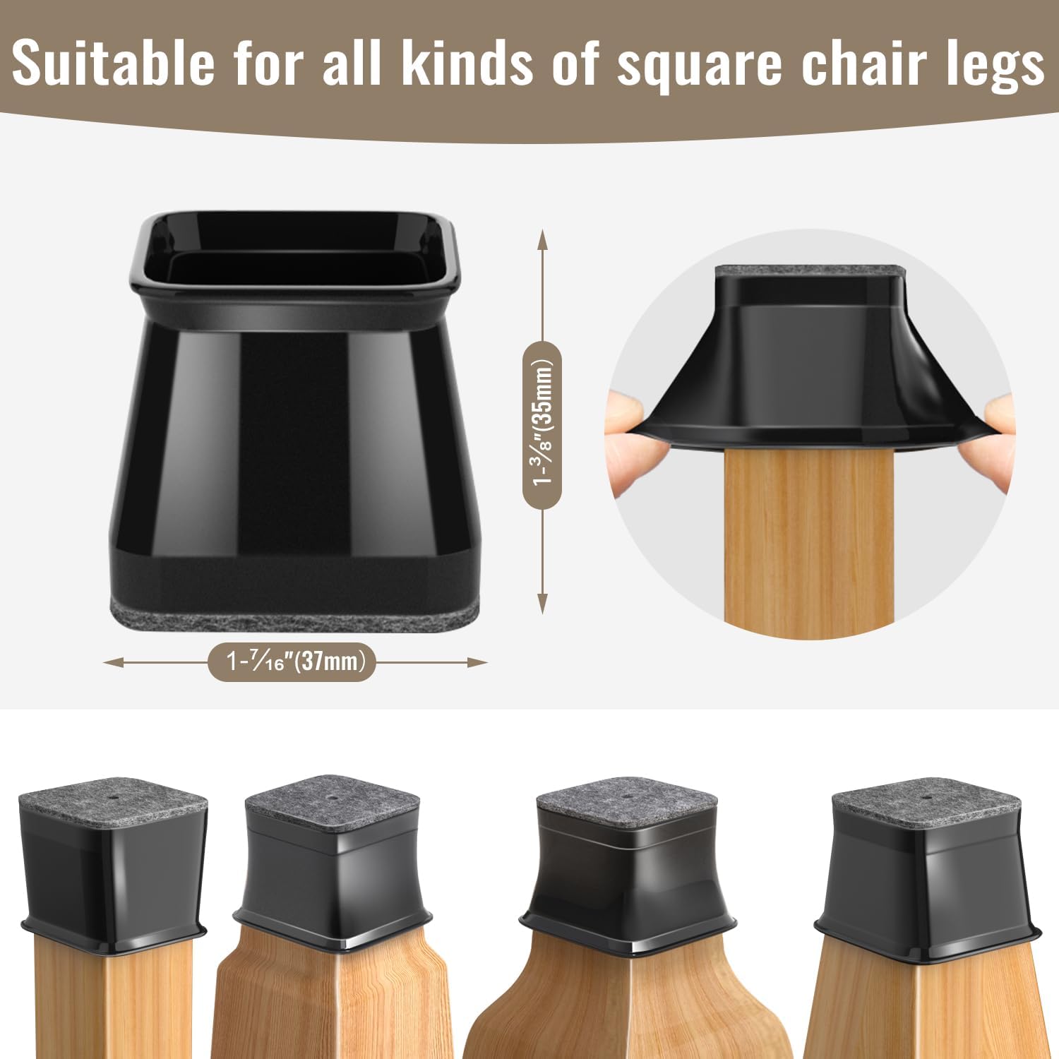 - Size application: They fit snugly on different chair legs. Measure the side length and pick the size that matches: S (3/4" ~ 1"), L (1-1/16" ~ 1-5/8"), or XL (1-5/8" ~ 2").