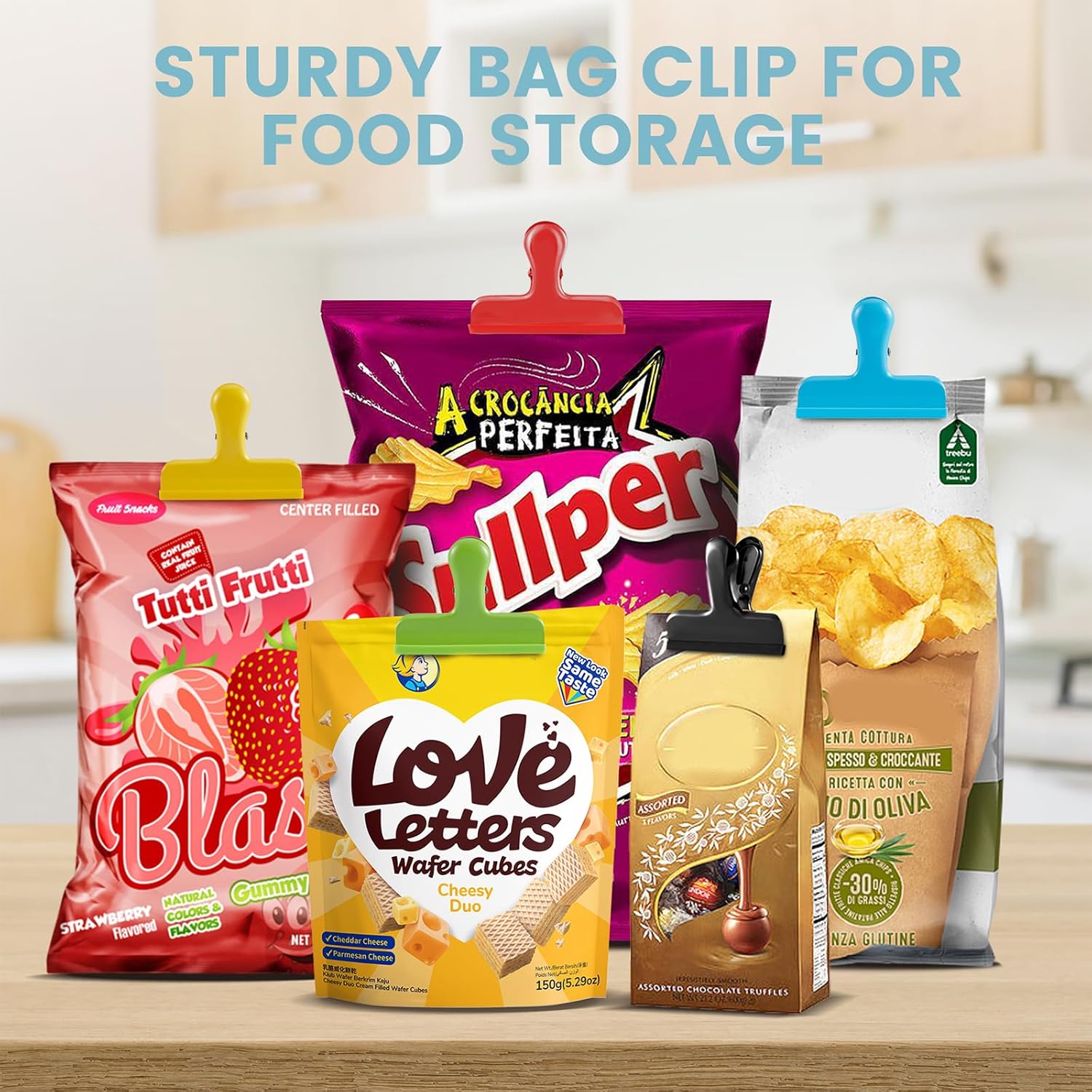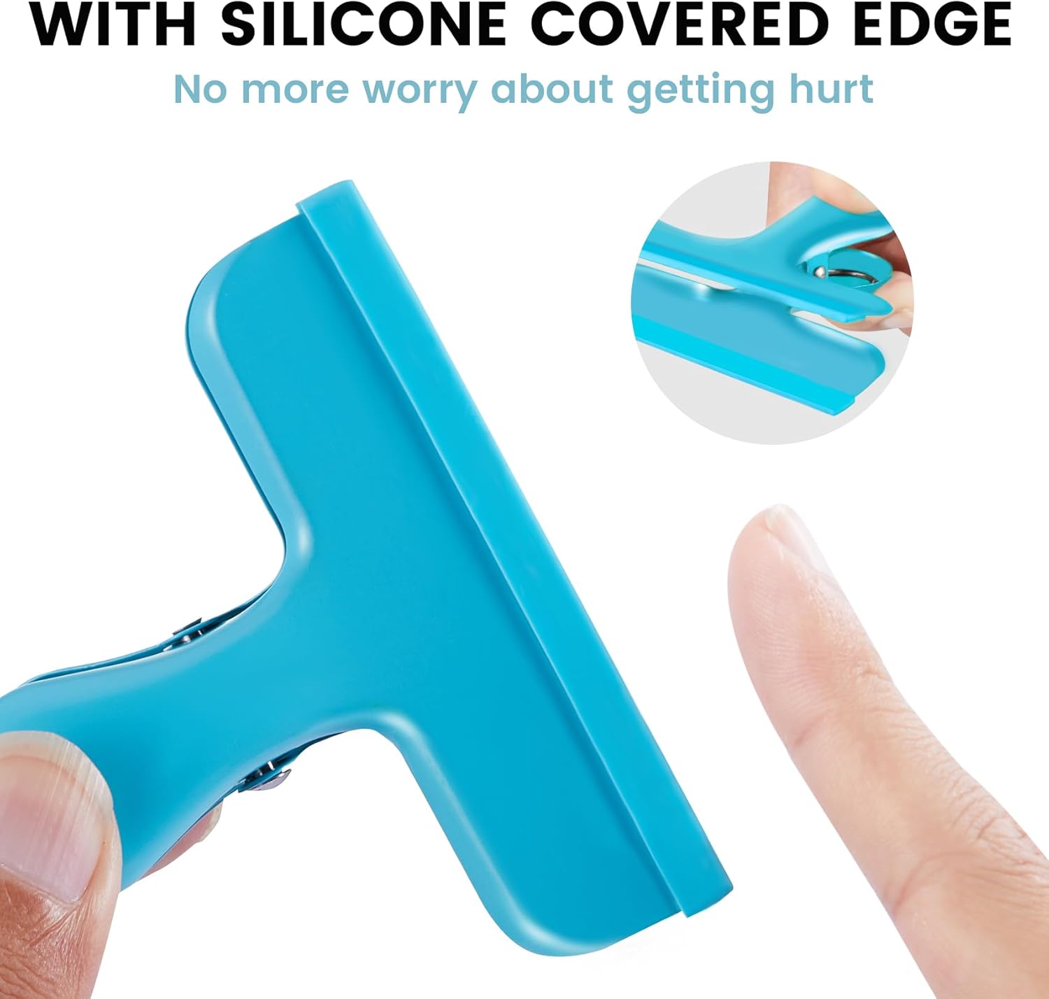 HOUSE AGAIN 8 Pack Stainless Steel Chip Bag Clips Covered with Silicone - NO More Sharp Edges - Color Coded for Food Bags - Air Tight Seal, Heavy Duty, 3 Inches Wide, Red, Yellow, Blue, Green