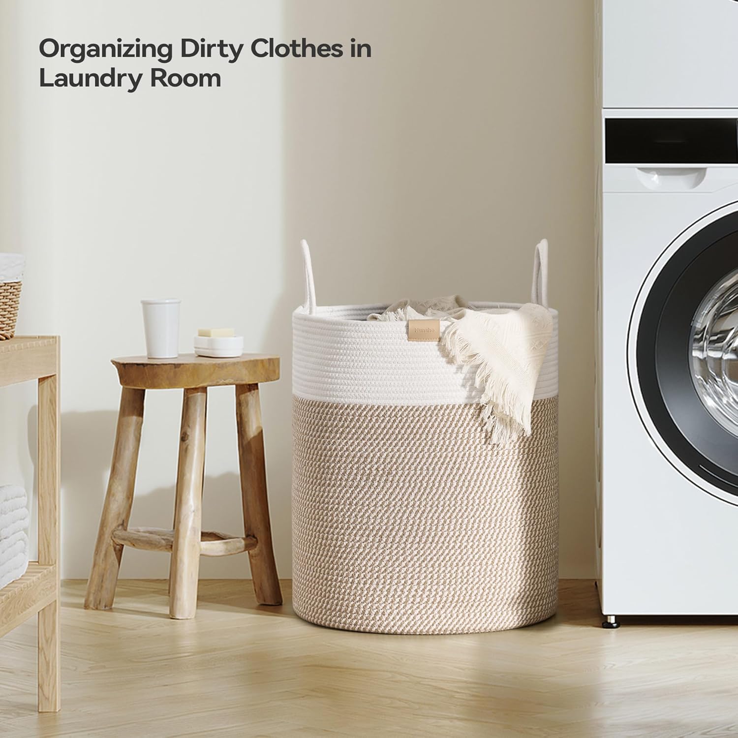 Laundry Hamper 62L,Large Laundry Basket for Clothes,Decorative Storage Basket for Blankets,Cotton Rope Woven basket for bedroom,Brown White