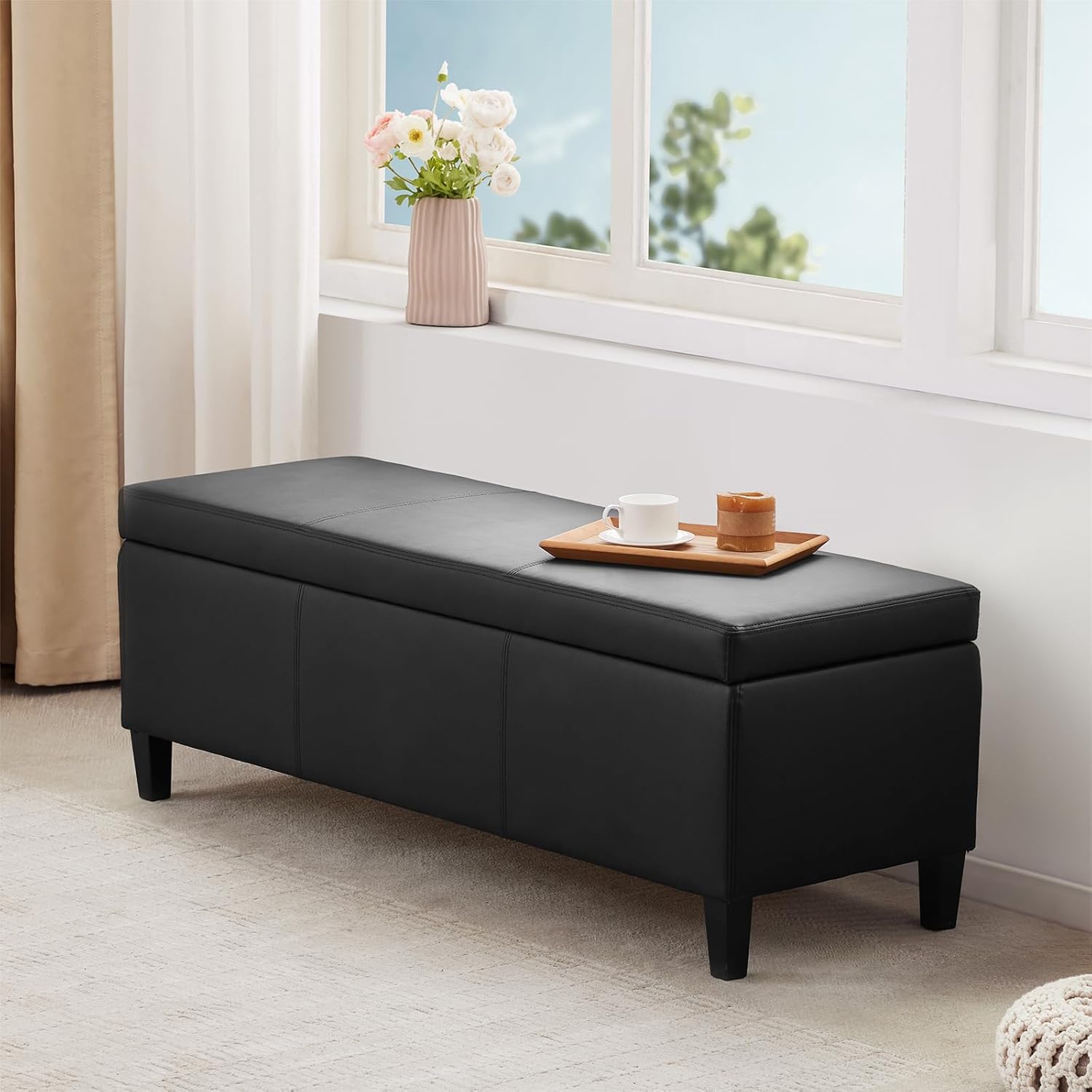HUIMO Faux Leather Storage Ottoman Bench 50.3 Inch Extra Long PU Upholstered Bedroom Bench with Large Storage Space for The Living Room, Entryway, Bedroom Hold Up to 300lbs (Black)