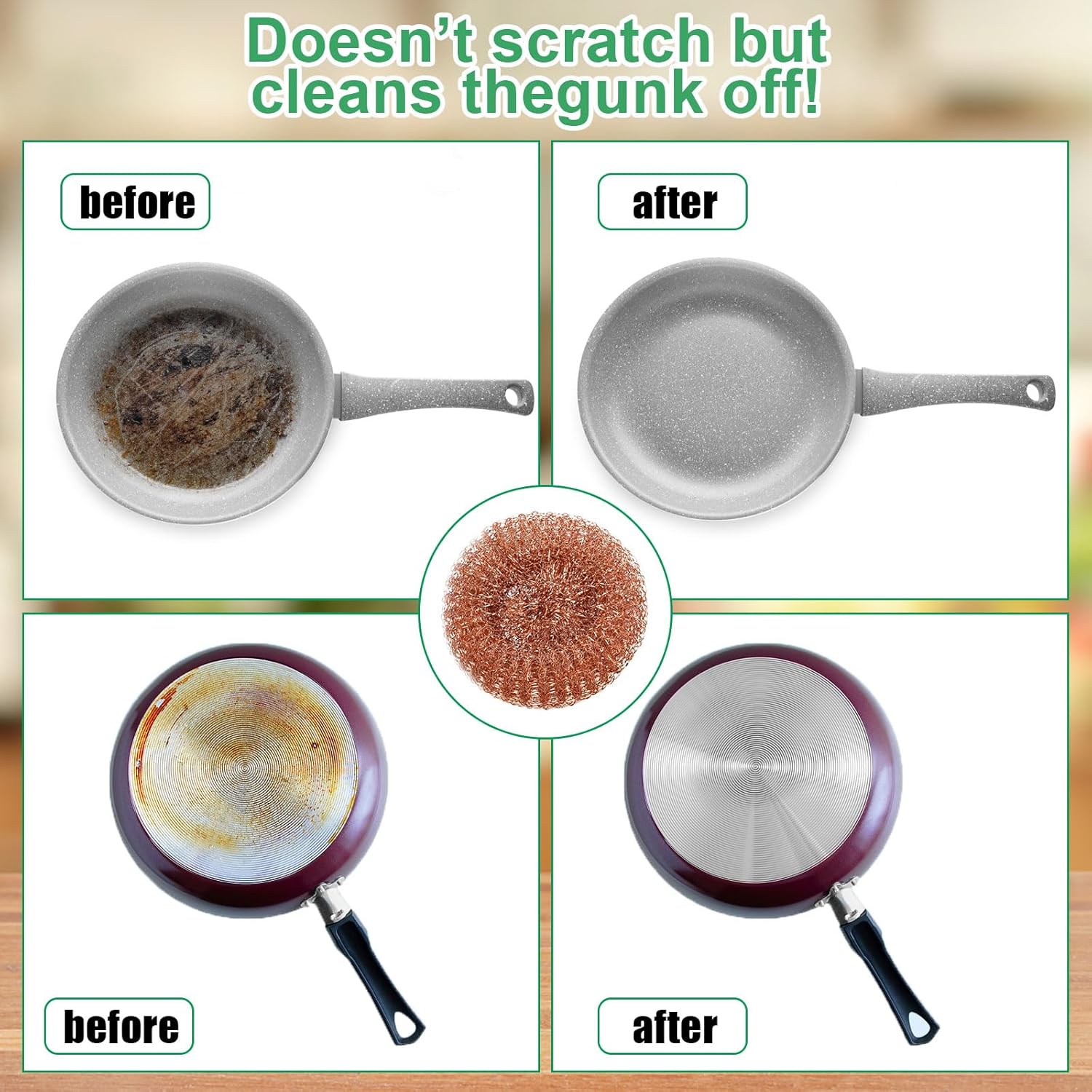 - Easy to Use: using copper coated scourers to remove caked on, baked on mess, cleaning pans becomes easy and effective, just rinse with water, and they will be like new; They won't rust or give off bad smells, and come with rubber gloves, can provide nice protection for your hands