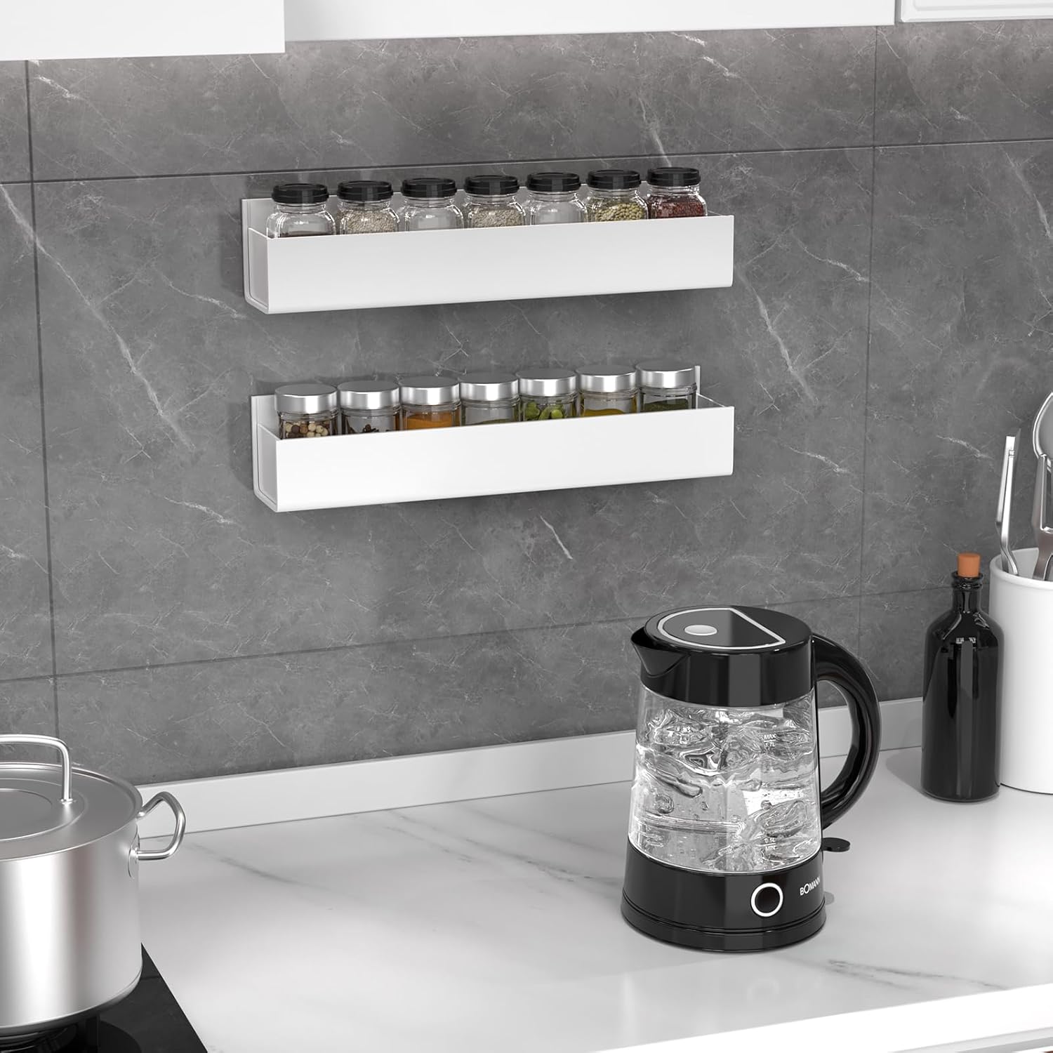 PMMASTO Adhesive Acrylic Spice Rack Organizer for Wall with Nano Double Sided Tape, Spice Shelf Organization for Kitchen Cabinet Door/Pantry Door, Wall Mount Seasoning Rack (White-2 Pack)
