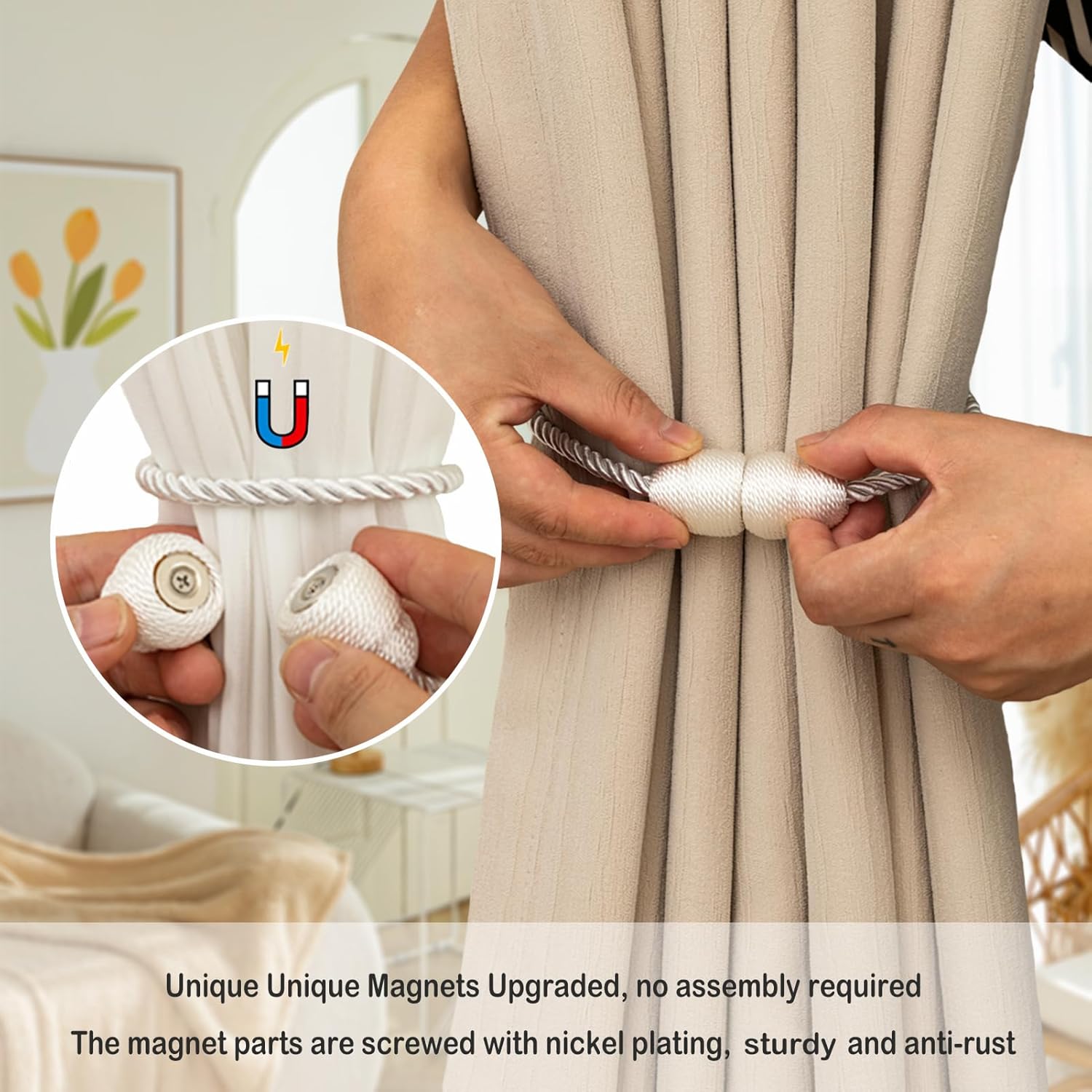 - High-quality materials: Our curtain tiebacks are made of high-strength polyester, Curtain ties made of this material have a comfortable touch. Curtain tiebacks with the latest upgrade magnetic design, Screw fixing does not fall off.