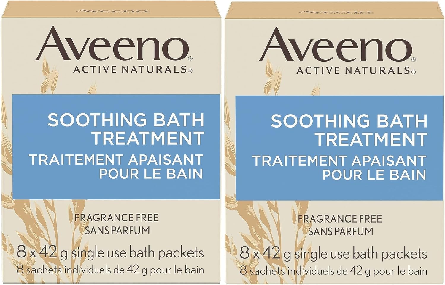 - 8-count of single-use, individually wrapped packets of Aveeno Fragrance-Free Soothing Bath Treatment with 100% Natural Colloidal Oatmeal for temporary protection and relief of dry, itchy, and irritated skin