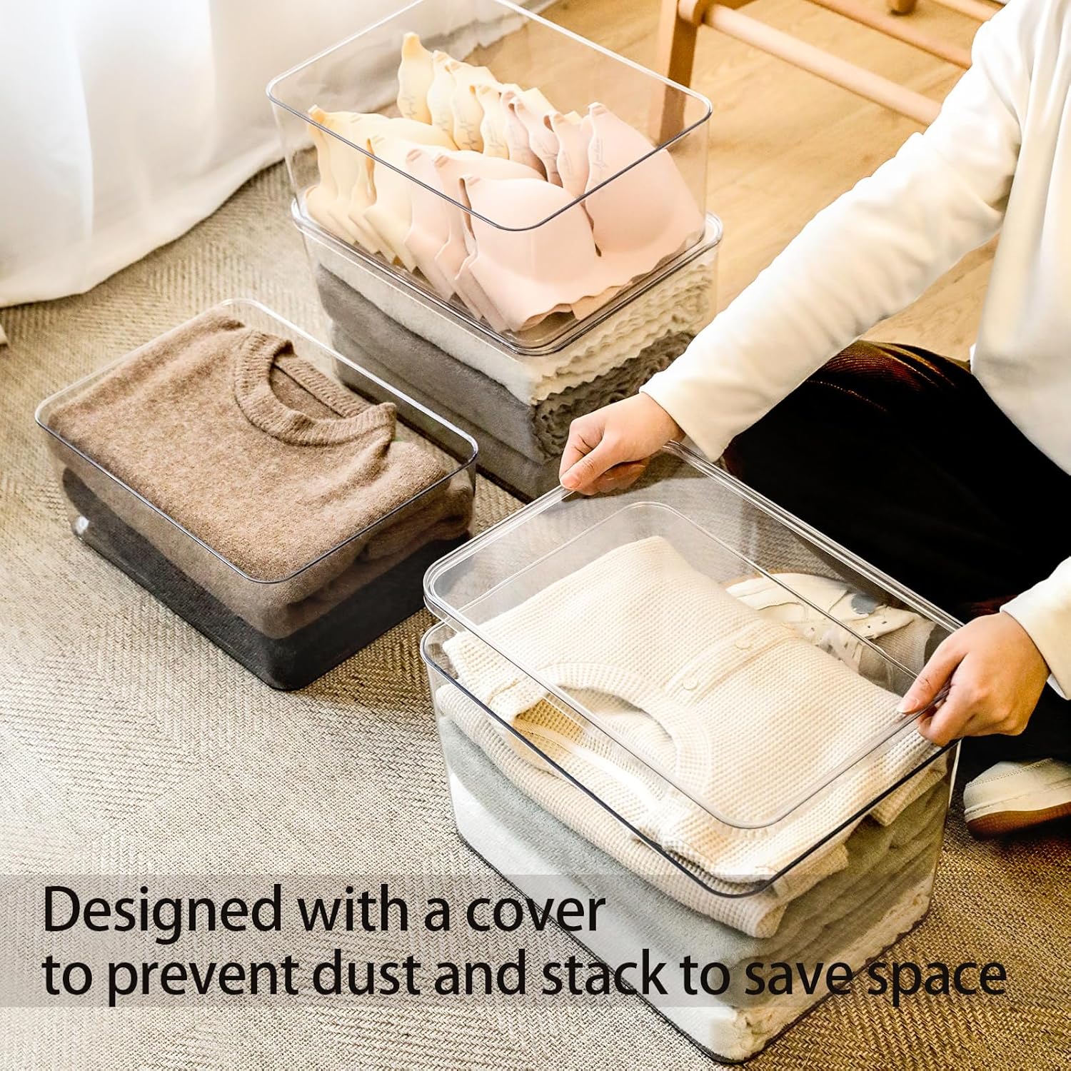 - 2. The transparent box can clearly see what is inside and find what you want at a glance. It is very suitable for storing clothes, food, shoes, toys, books, scarves, etc