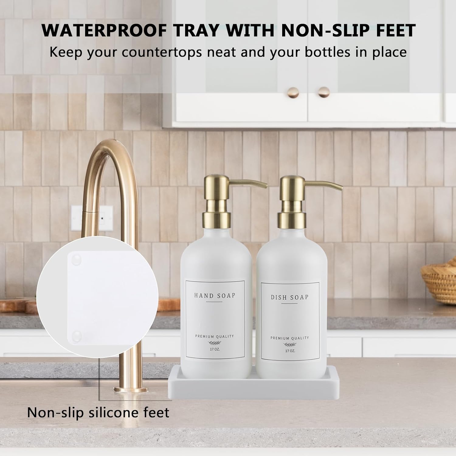 - GREAT VALUE FUNCTIONAL & AESTHETIC DISH AND HAND SOAP DISPENSER SET: 2 fortified lead-free reusable glass kitchen soap dispenser, 2 sleek gold stainless steel pump to match your sink hardware, 1 collapsible silicone funnel, 1 durable waterproof soap dispenser tray, 7 kinds of waterproof stickers and 2 color ( Hand Soap, Dish Soap, Hand Lotion, Shampoo, Conditioner, Body Wash, Sanitizer), suitable for any style of home decor.