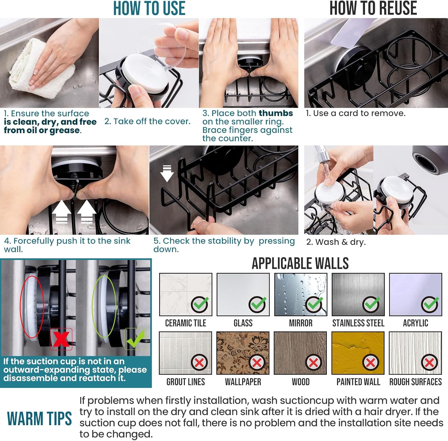 - [1 Second Installation & Removable]: Simply choose a smooth and dry surface without any grout, take off the protective cover and push the board "PUSH" hard until you hear "PUFF", ONE second to complete the installation.. No screws, no nails, no glue, no tools. The kitchen sink caddy can be re-positioned many times and removed without leaving residues (If problems when firstly installation, wash suction cup with warm water and try to install on the dry and clean sink after it is dried with a hair dryer)