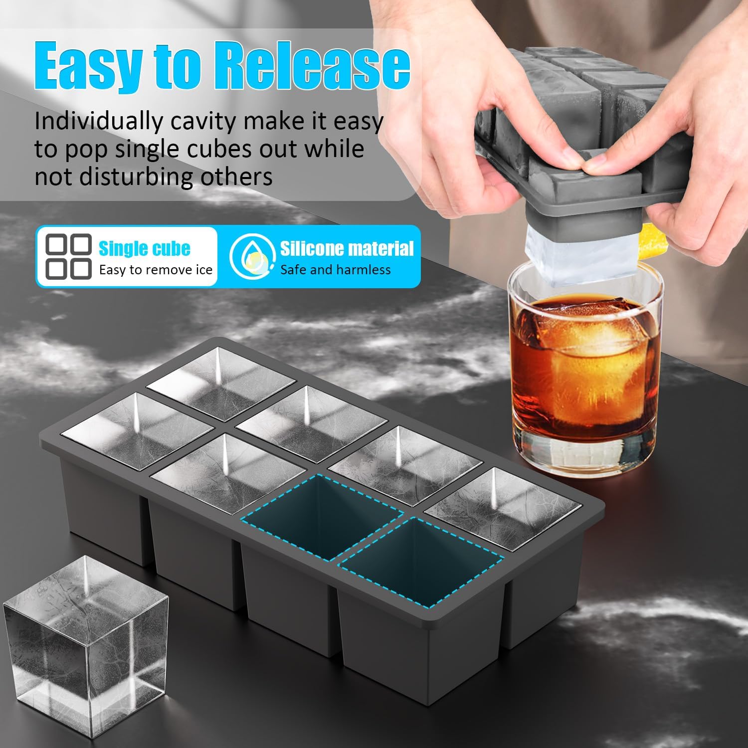 - SLOW-MELTING LARGE ICE CUBE: Ice tray make 8 square ice cubes of 2 inches at a time. The huge ice cubes will cool the drink quickly without diluting them, ensuring the original flavor of the drink. Perfect way to dress up Old Fashioned, Scotch, Bourbon, or Blended Whiskey.