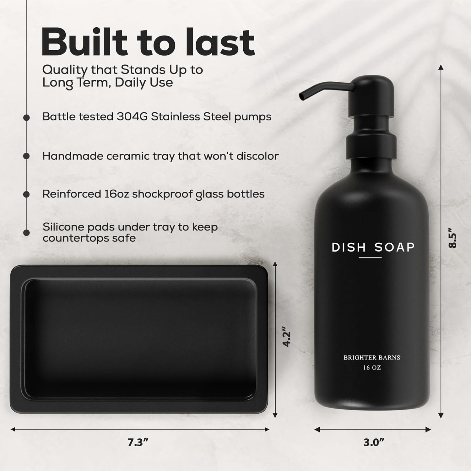 - AMERICAN DESIGN, UNCOMPROMISING QUALITY - Crafted with meticulous attention to detail, our black glass soap dispenser with pump set features 2 robust 16oz glass bottles, corrosion-proof 304G stainless steel pumps, and a stain-resistant ceramic tray. All designed in the USA to provide unbeatable quality and enduring style that you can trust.