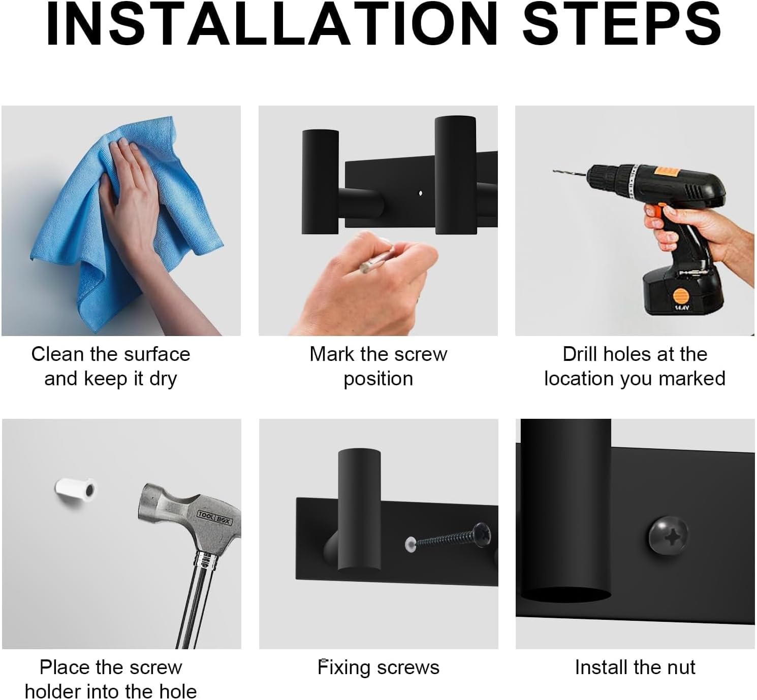 - Easy to install: Wall mounted hangers are easy to install on walls or wooden doors; The installation hardware includes screws, plastic expansion anchors, and washers
