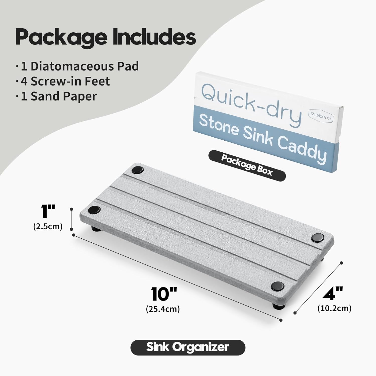 - 【Diatomaceous Earth Quick Stone Drying Tray】Keep your kitchen and bathroom countertops neatly arranged with this instant-drying stone sink caddy. This holder rack absorbs moisture quickly and is specially designed for your soaps, sponges, or brushes.