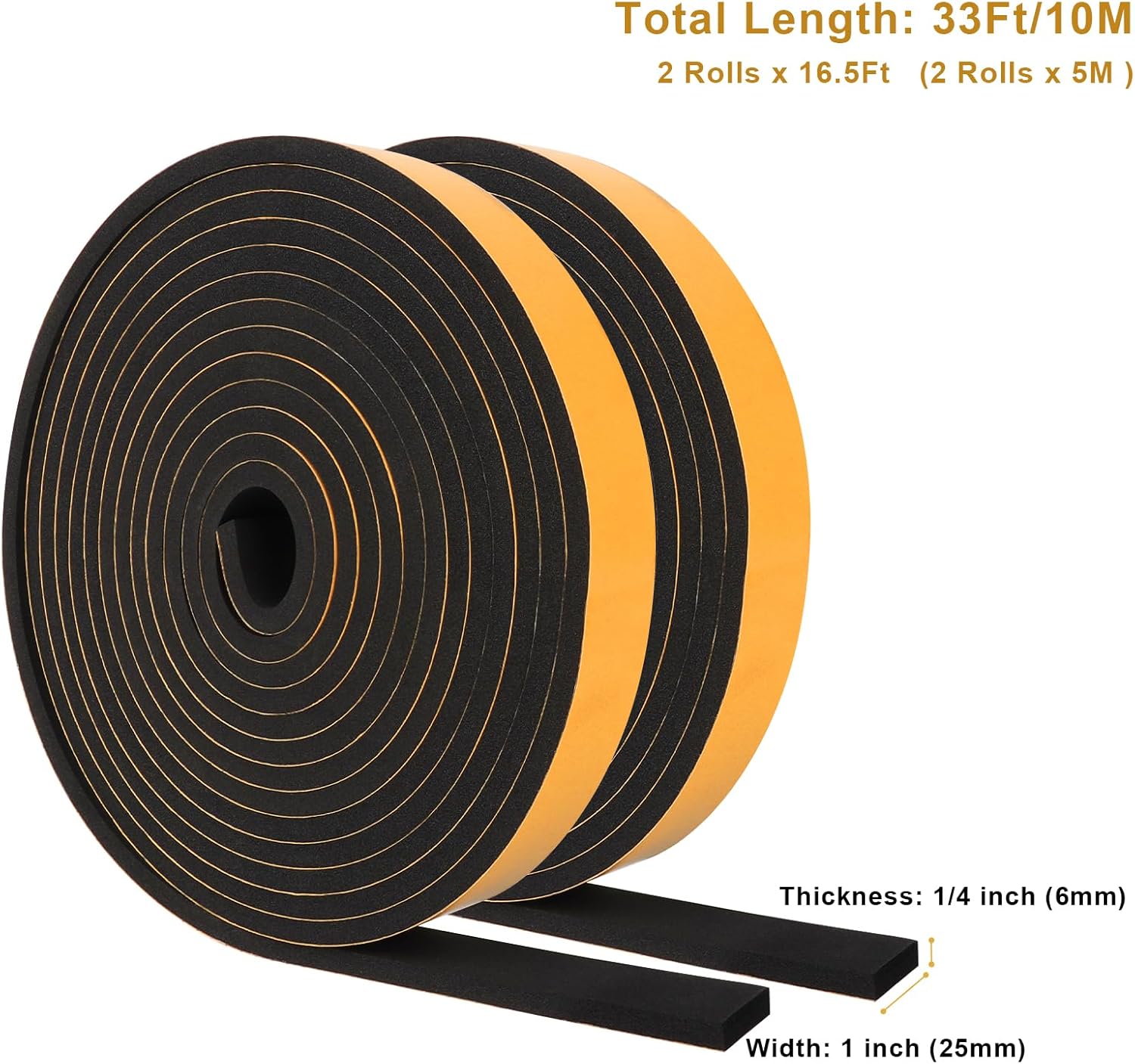 Weather Stripping Self Adhesive 1 in x 1/4 in, Weatherproof Foam Insulation Tapes Soundproof, High Density Seal Strips for Door Window, Easy Cut to Size, 2 Rolls Total 33Ft