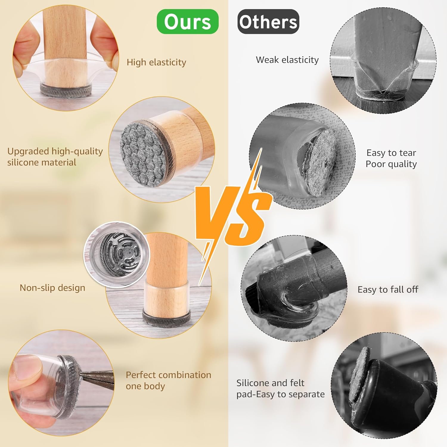 - ✅【Premium Quality Material】We would like to offer top-tier quality chair leg floor protectors at the most reasonable price. So we choose the premium quality silicone material. Our floor protectors for chairs are more clear and have higher thickness than most chair leg covers on the market, which are more durable and flexible, ensuring the floor protectors won't tear when stretched.