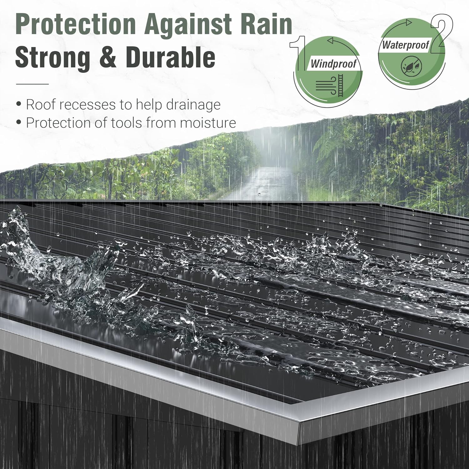 - STEEL FRAME CONSTRUCTION: This outdoor storage shed is made of galvanized steel. The whole is steel frame structure with added metal reinforcements inside and the exterior surface is covered