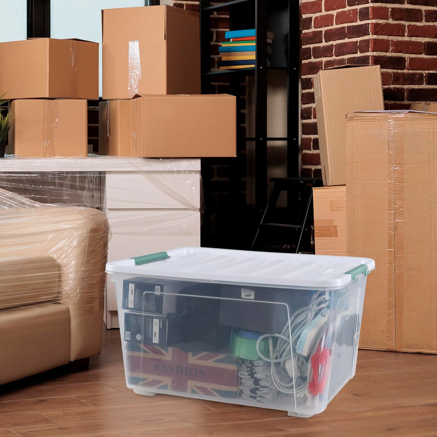 80 L Large Clear View Plastic Storage Bin with Lid and Secure Latching Buckles, 4-Pack Wheeled Clear Storage Boxes