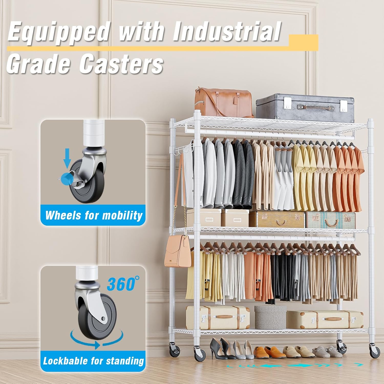 Homdox 3 Tier Garment Rack with Wheels, Portable Closets for Hanging Clothes Heavy Duty, Closet Racks and Shelving with Double Hanger Rods & Side Hooks, White