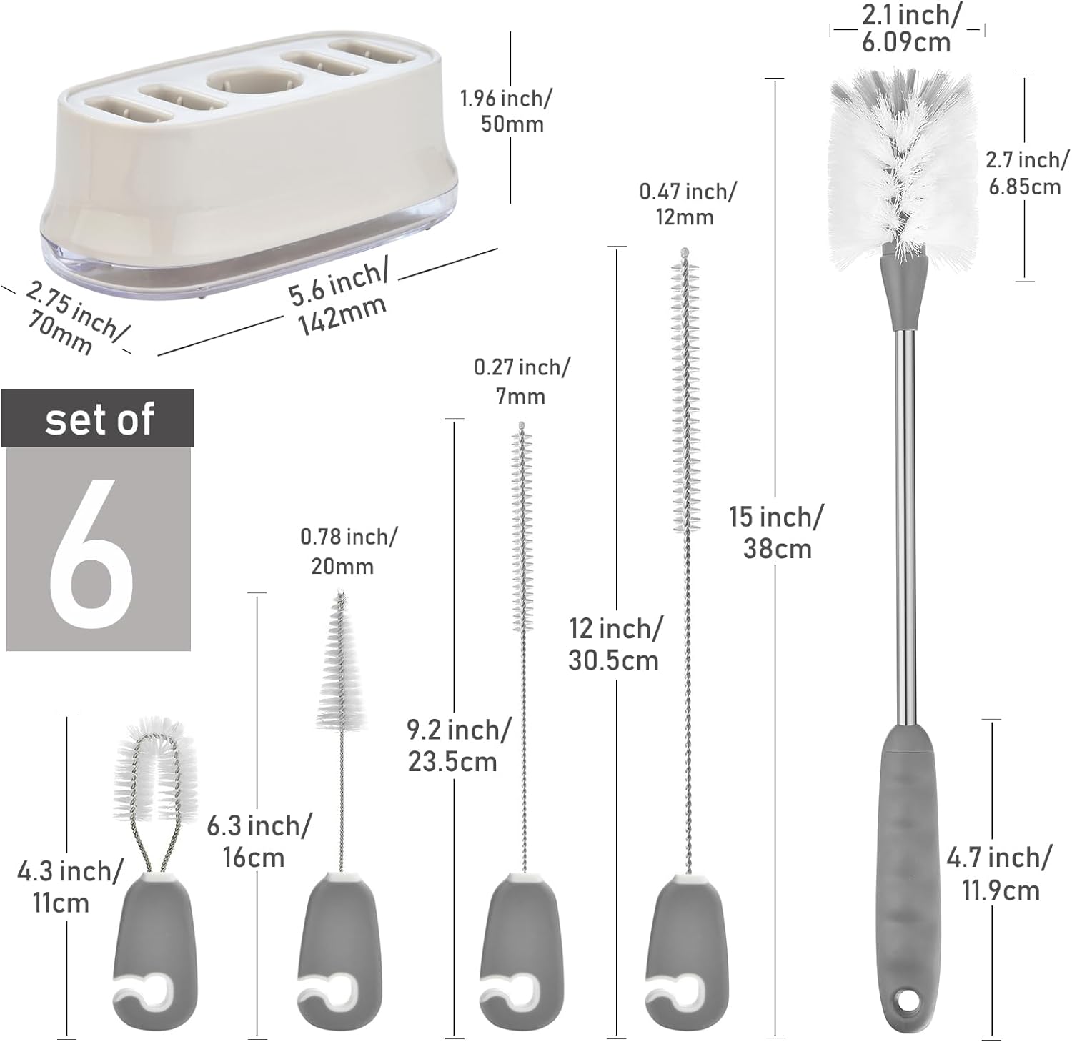 - BRUSH SET WITH HOLDER - Get 5 counts brush, 1 long bottle brush, 1 long wide straw brush, 1 narrow pipe cleaner, 1 lid brush, 1 detail brush and 1 drainage stand. This all-in-one set has everything you need to get bottles and straws squeaky clean.
