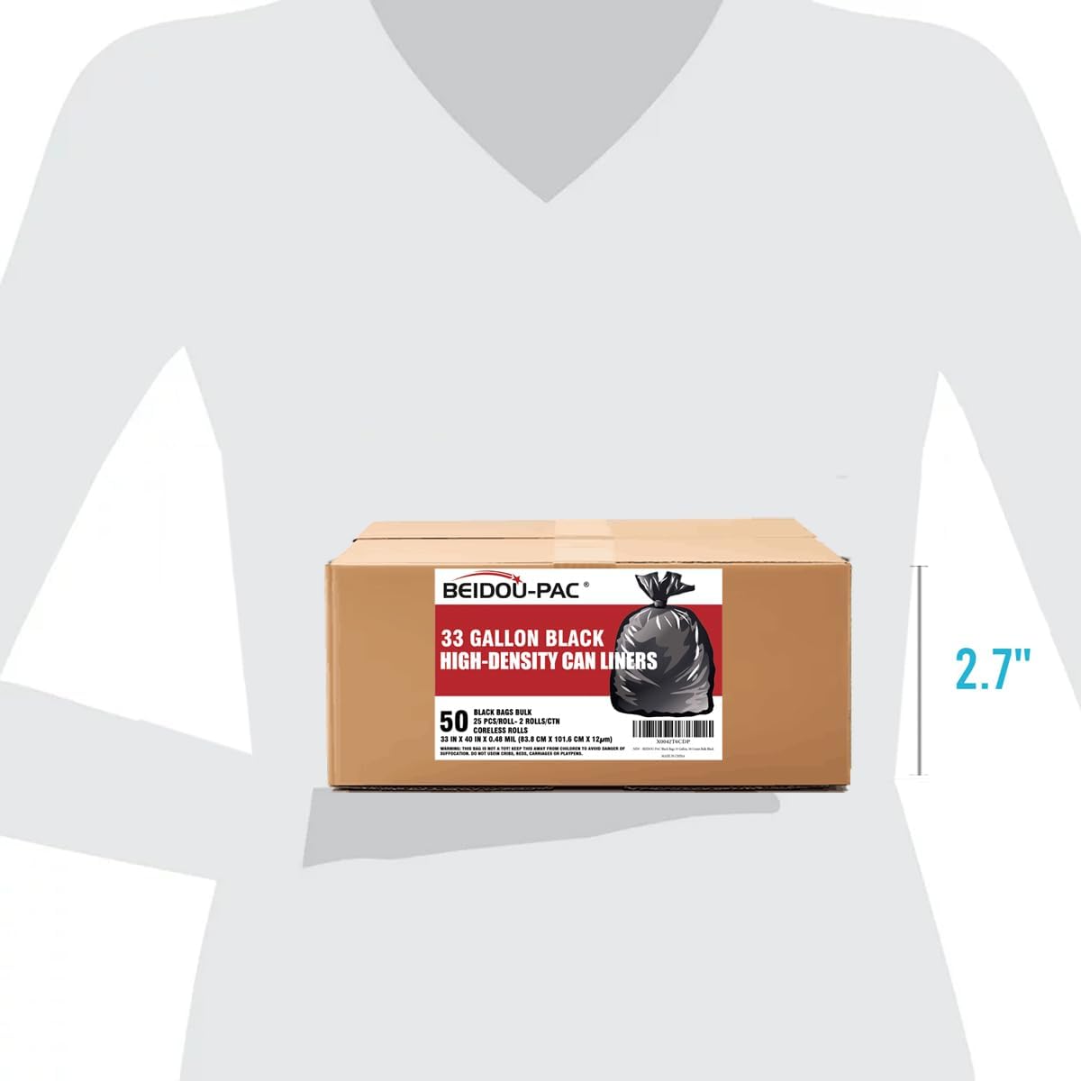 - 1, Product information: BEIDOU-PAC 33 gallon balck plastic can liners, Size: 33"*40"x 12 mic, Total 125 clear bags bulk (25 PCS/ROLL, 2 CORELESS ROLLS/CTN), Perfect for 33 Gal Capacity Office, commercial, industrial, or residential waste.