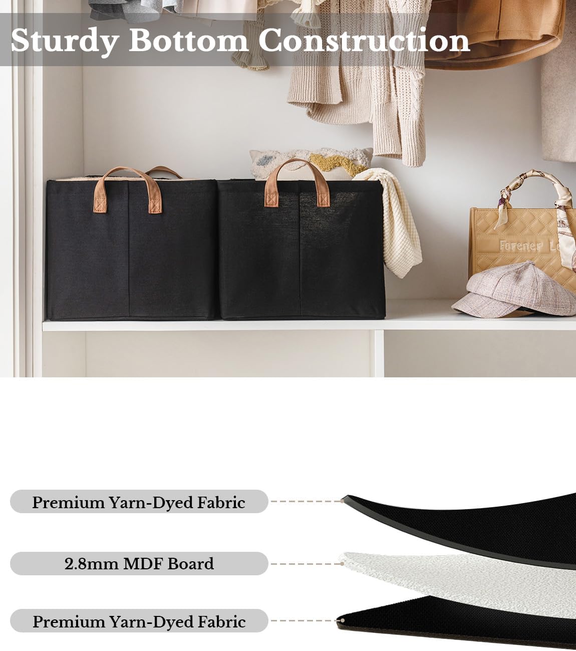 - Premium Quality: Made from high-quality fabric and reinforced with a heavy-duty MDF bottom board and a sturdy metal frame. The solid construction enables the storage bins to stand upright without support, even when empty.