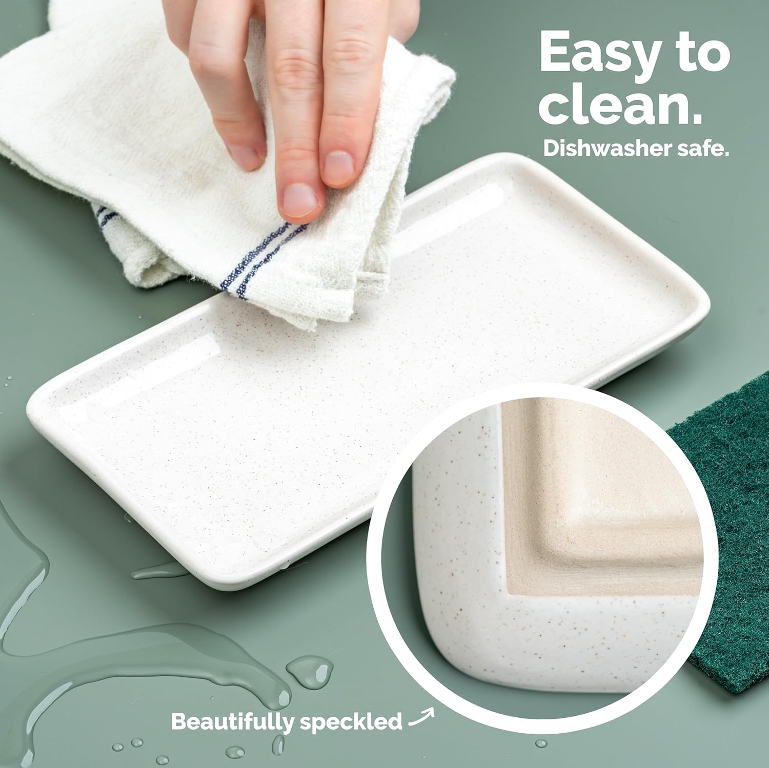- CERAMIC TRAY: Elevate your kitchen decor with an elegant, white-speckled tray. This heavy, sturdy, and easy-to-clean tray is the perfect countertop accessory.