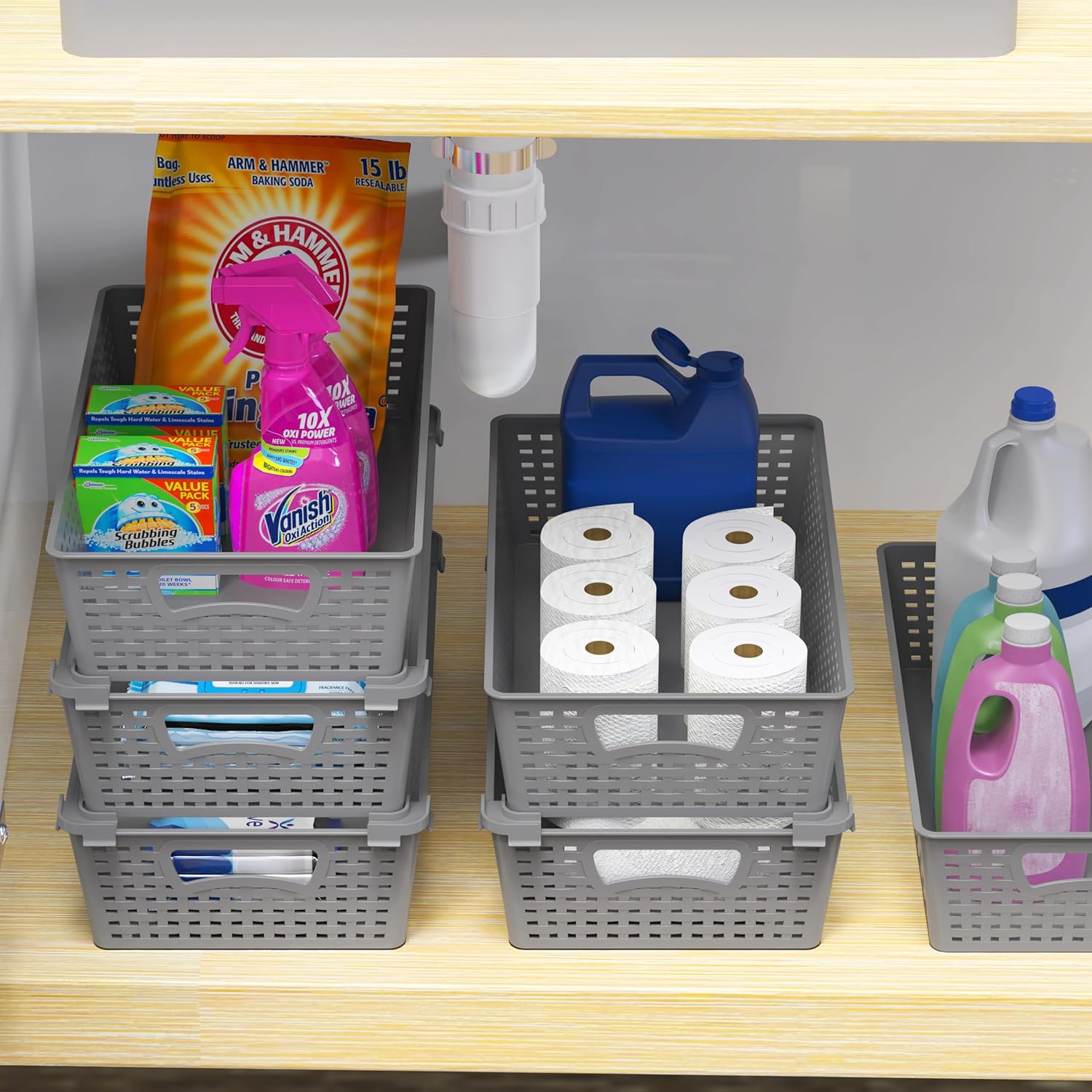 Simple Houseware Stackable Plastic Woven Basket Organizer, 6 Pack, 14.5" x 8.5" x 3.5", Gray