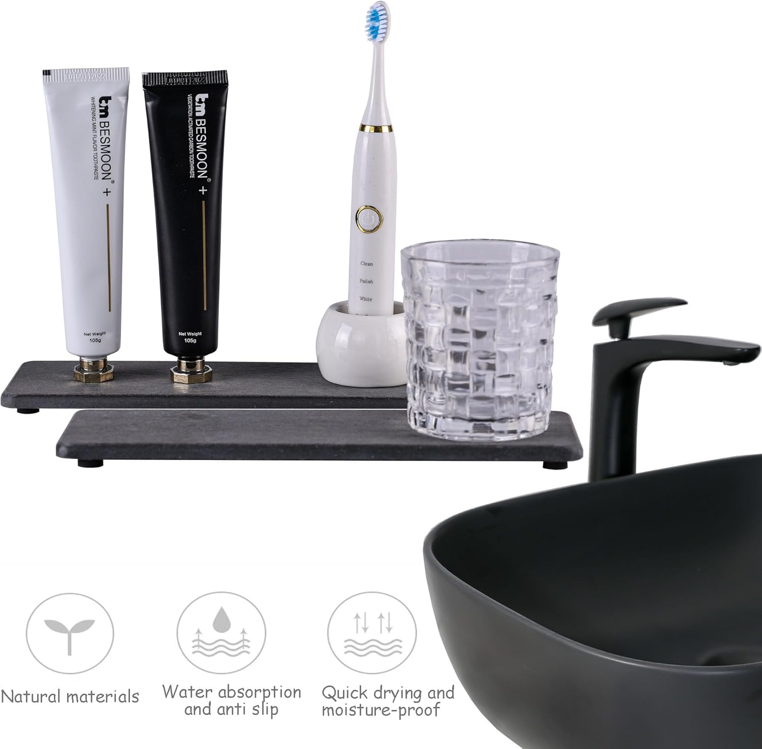 - Made from natural Diatom mud and plant fiber, small holes within diatomite enable it have amazing water absorption. They could absorb water and gets dry in a few minutes. It makes the Bathroom Counter top more dry and tidy.