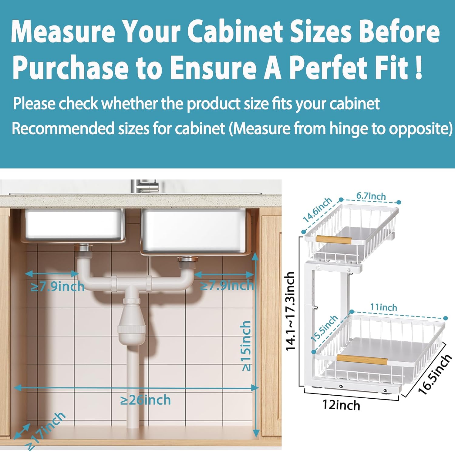 - Larger Size and Storage Capacity: Liuoud upgraded under sink pull out organizer larger than others. The upper basket measured 14.6”×6.7”×2.5”, the lower basket measured 11”×15”×23.3”