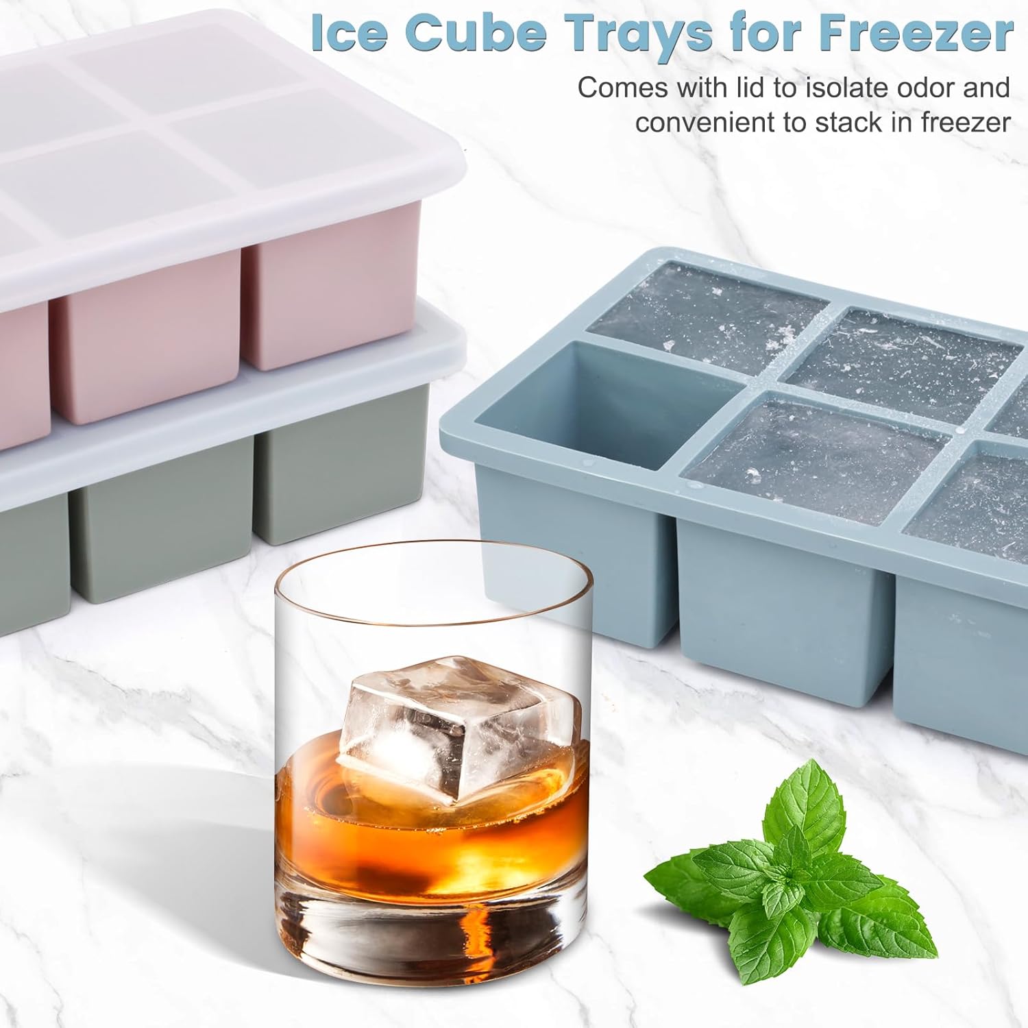 Large Silicone Ice Cube Tray 3Pack, SAWNZC Big Square Ice Cube Molds for Whisky Cocktail, Ice Maker Tray with Lid for Freezer, Easy Release (3, Blue+Green+Pink)