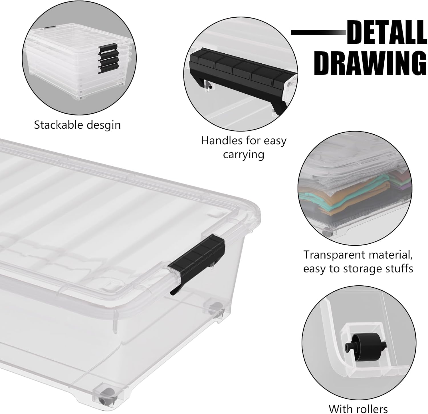 4 Pack Multipurpose 25 Qt Underbed Secure Latching Bin, Plastic Storage Container with Snap-On Lid and Wheels, Clear