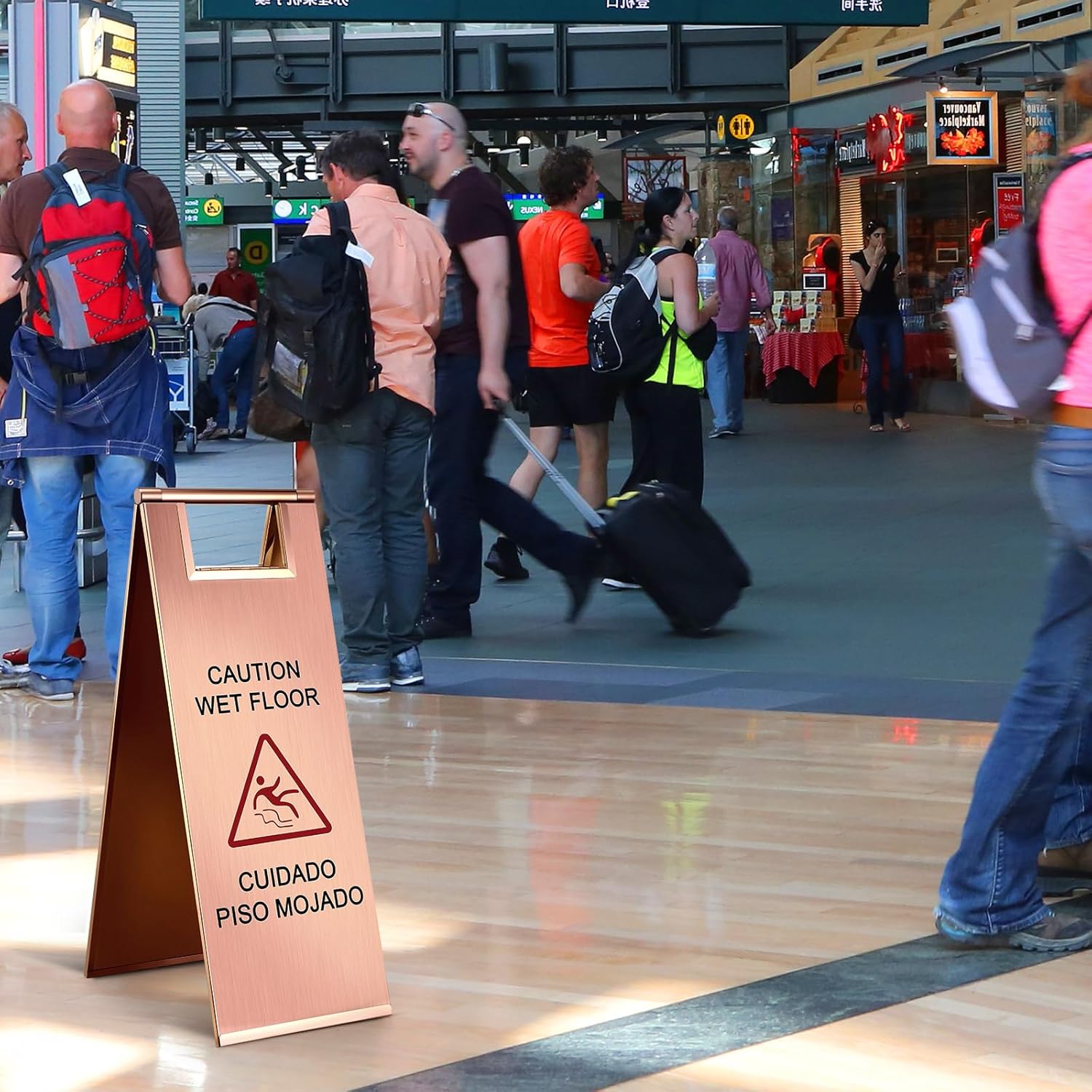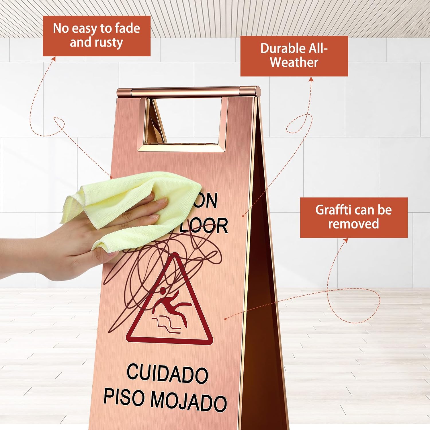 Kigley 2 Pcs Wet Floor Sign, 24 Inch Stainless Steel Caution Wet Floor Sign Double Sided Portable Foldable Bilingual Safety Warning for Hotel Market Restroom Restaurant Office (Rose Gold)