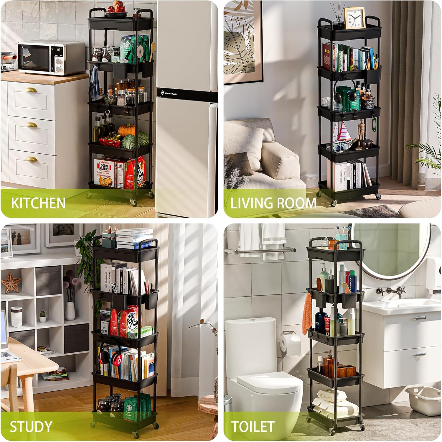 5 Tier Rolling Cart Organizer,Bathroom Cart Organizers with Wheels Laundry Room Organization Mobile Shelving Unit Utility Cart Storage Shelves Multi-Functional for Office, Home(Black)
