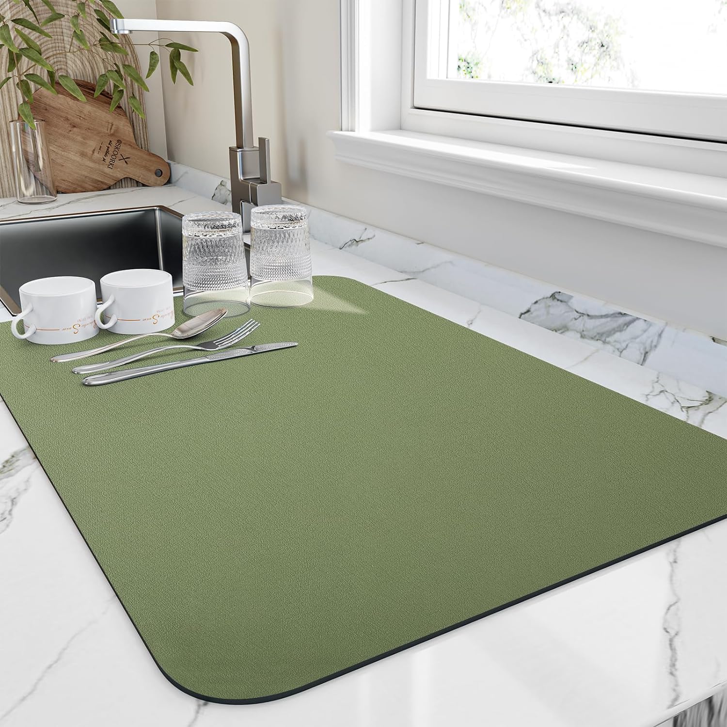 Dish Drying Mat for Kitchen Counter, Heat Resistant Drainer Mats with Non-slip Rubber Backed, Hide Stain Kitchen Super Absorbent Draining Mat, Easy to Clean Dish Rack Pad, Green 18"x32"