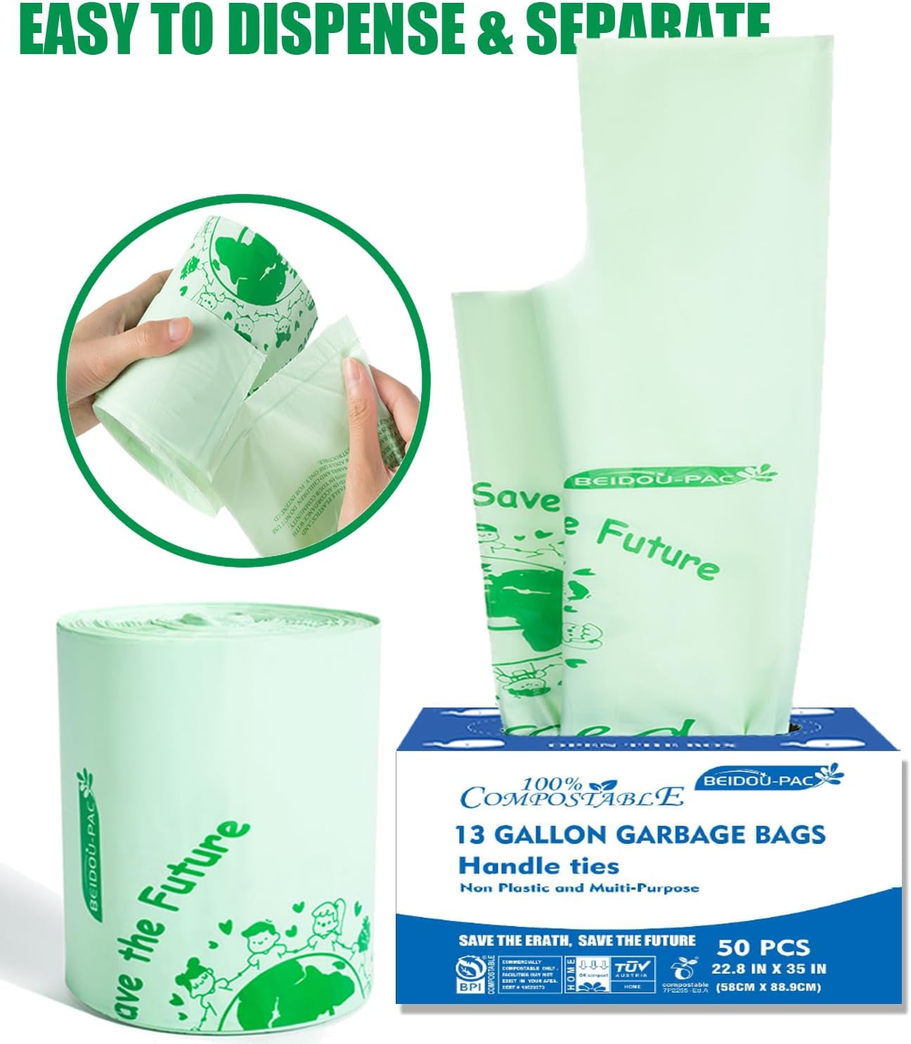 - [TALL KITCHEN COMPOST BIN COMPATIBLE] -- BEIDOU-PAC Compostable Bags, 13 gallon (49.2 liters) 22.8" x 35" x 0.75 mils, 50 bags per roll (Pack of 2), home compostable and biodegradable are compatible with a backyard compost system. Our compost trash bags can perfect for 13-gallon under-the-sink kitchen trash can.
