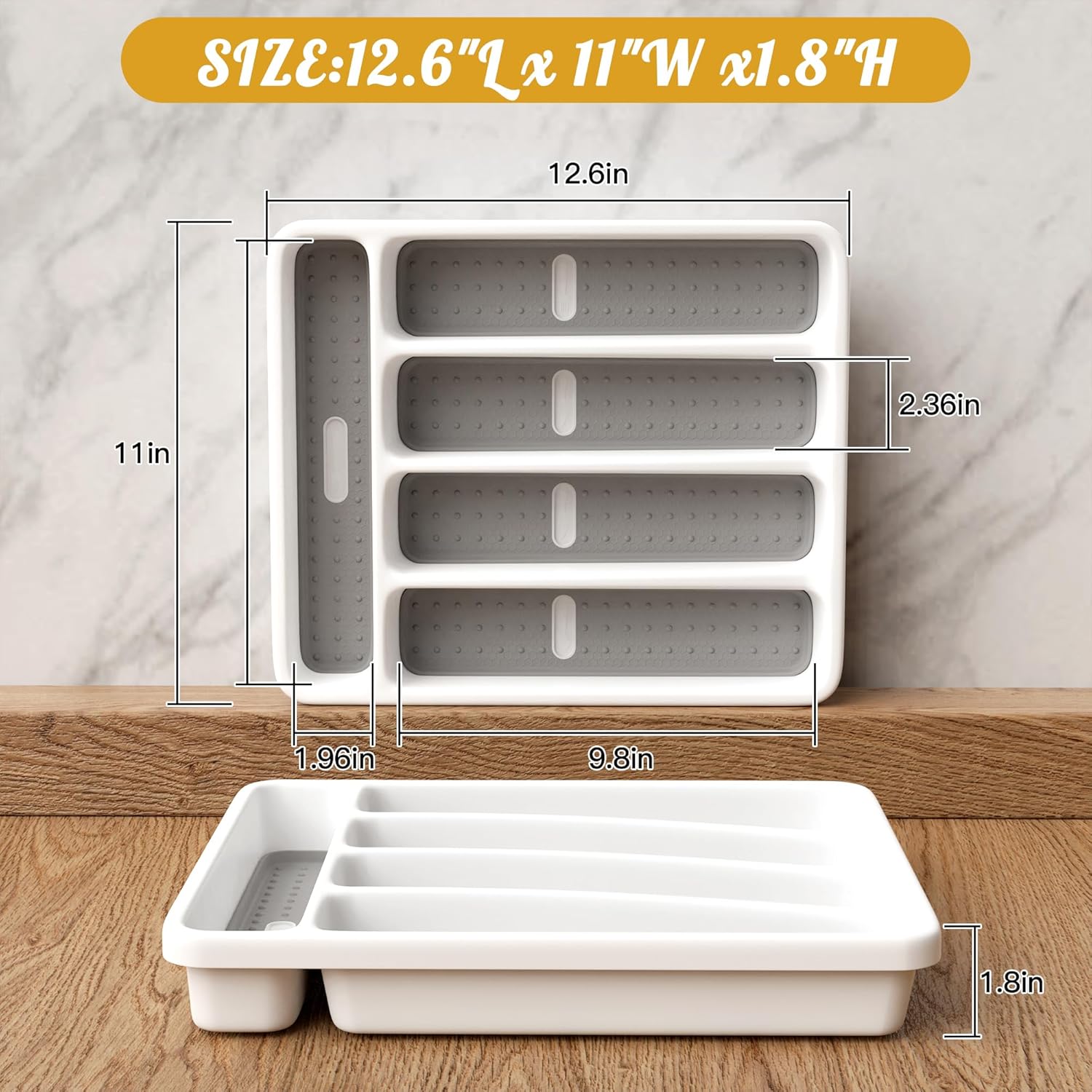 5-Slot Utensil Drawer Organizer for Silverware & Cutlery | Large Plastic Utensil Holder with Non-Slip Design, Silverware Drawer Organizer, BPA-Free (White)