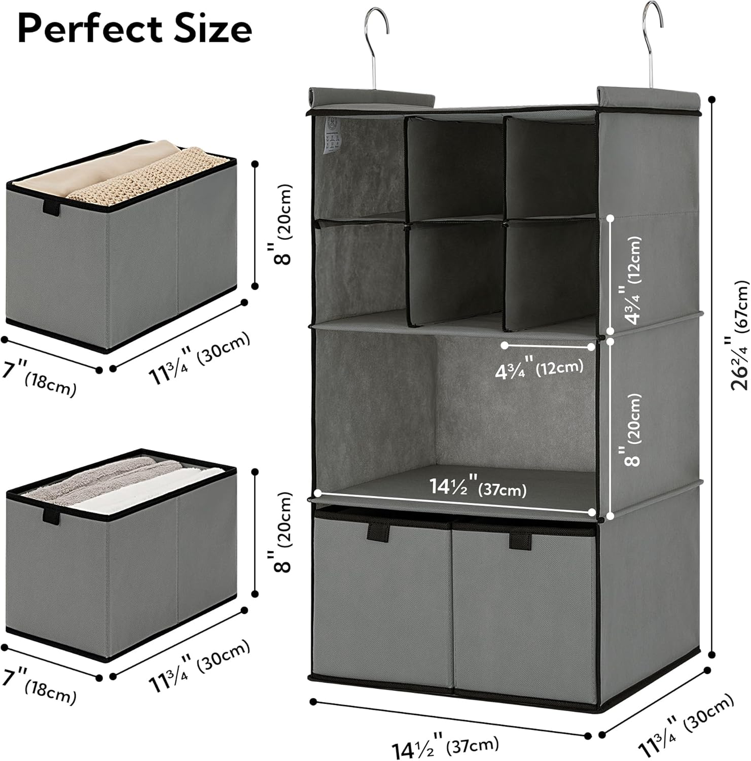 - 2 Removable Drawers: Measures 14½"L x 11¾"W x 26½"H. The open design of hanging closet shelves comes with 2 removable drawer dividers that slide out for easy access when needed, not only dust-proofing but also providing optimal space for storing socks, underwear, and other private items.