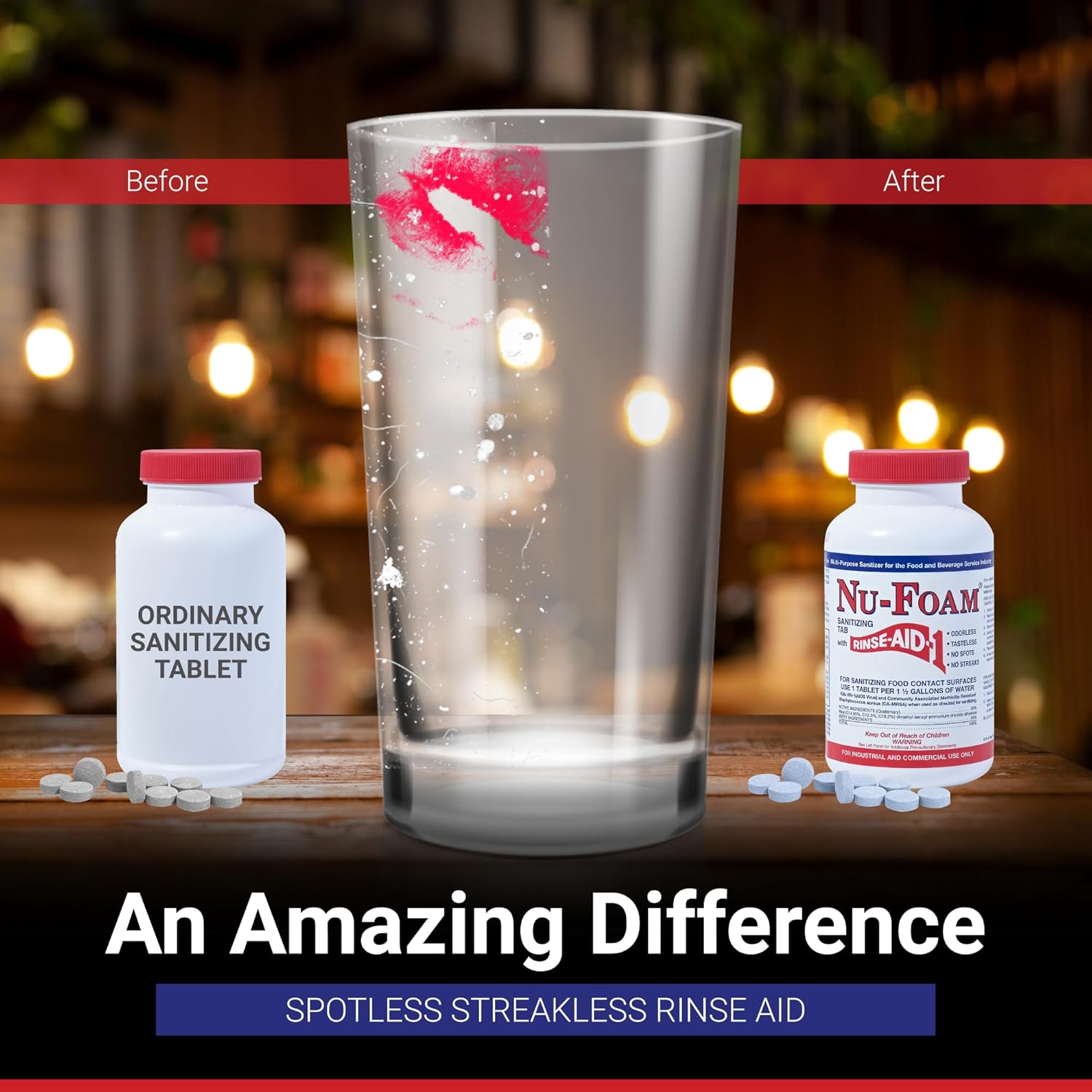 - Gleaming Team Results: Use your tablets in conjunction with Nu-Foam detergent to ensure the cleanest glassware possible. With a rinse aid that allows water to sheet off the glass, our cleansing formula leaves no spots or streaks, improving your image among customers and saving big with always high-quality tap beer pours. Opt for this winning combination for bar tool and glassware appearance, performance, and longevity.