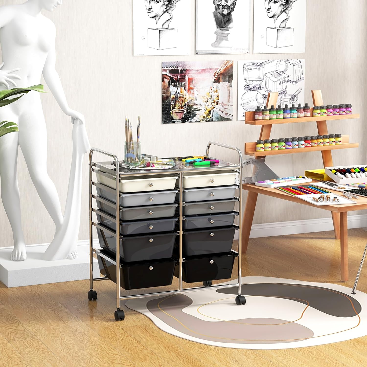 GOFLAME 12-Drawer Rolling Storage Cart, Multipurpose Organizer Cart with 2 Sizes Plastic Drawers, Mobile Utility Cart with Lockable Casters for School, Home Office, Beauty Salon, Gradient Grey