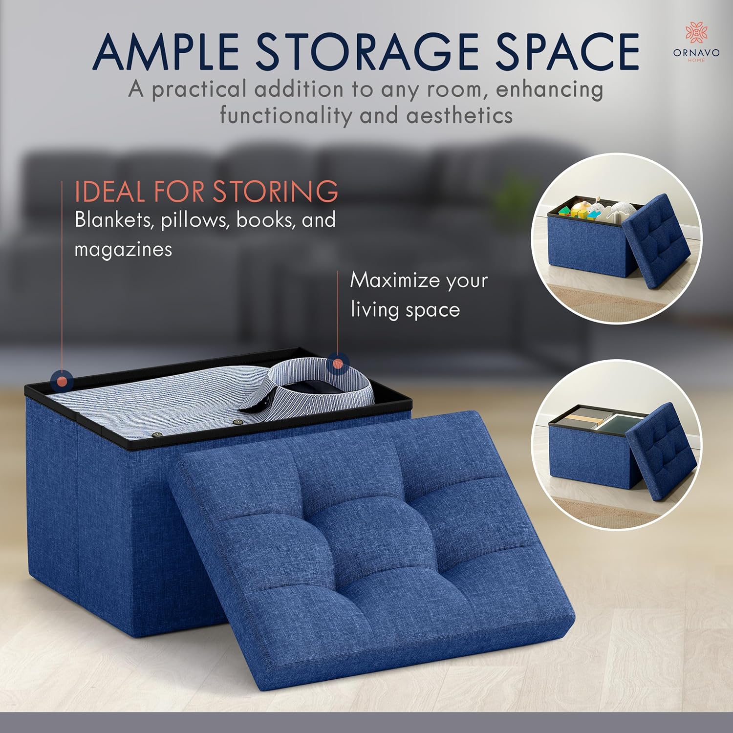 Ornavo Home Small Storage Ottoman Foldable Collapsible Rectangle Linen Ottoman Foot Rest Stool Seat, for Living Room, Bedroom, Home Office, Dorm - 12 x 16 x 12, Navy Blue