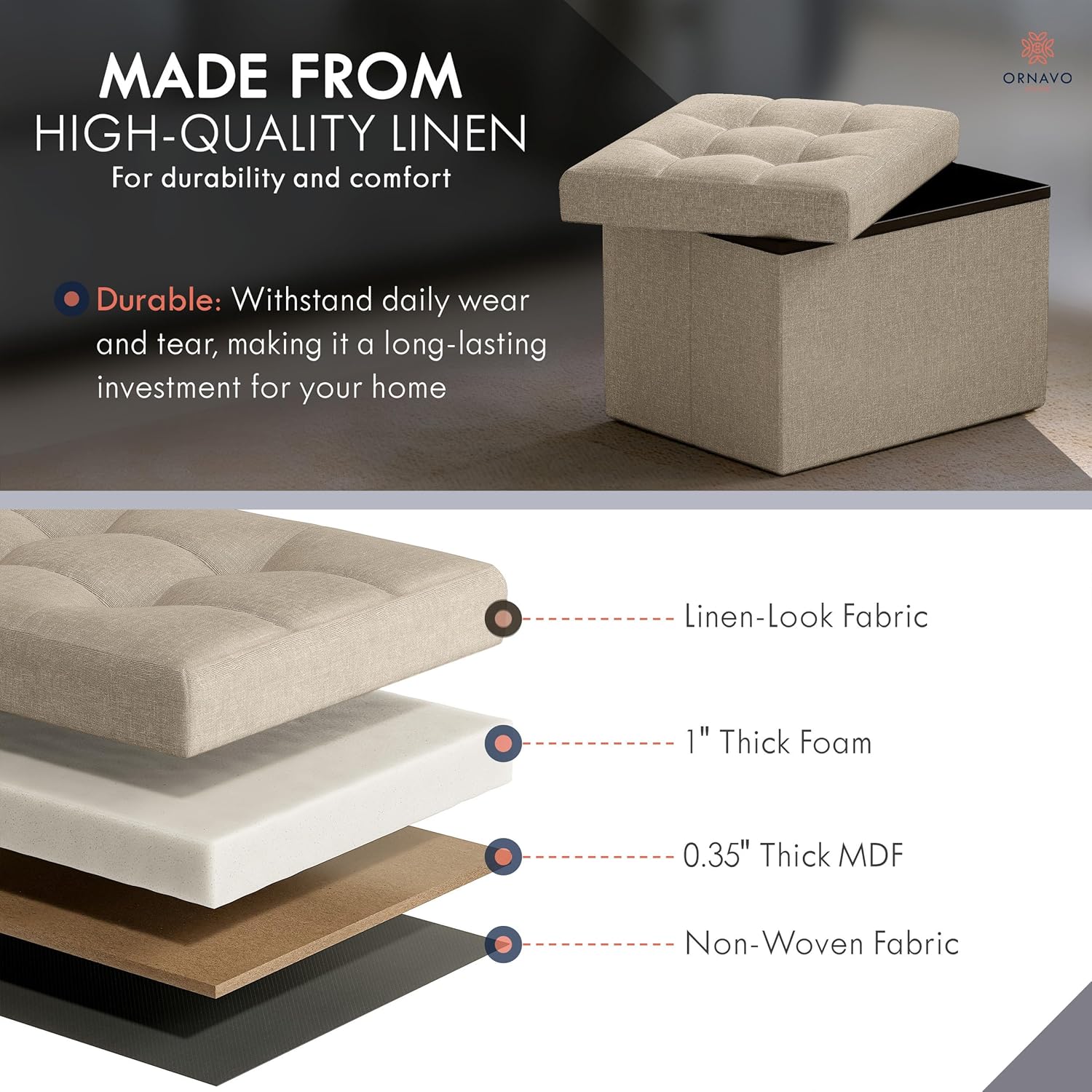 Ornavo Home Small Storage Ottoman, Set of 2, Foldable Collapsible Rectangle Linen Ottoman Foot Rest Stool Seat, for Living Room, Bedroom, Home Office, Dorm - 12 x 16 x 12, Taupe