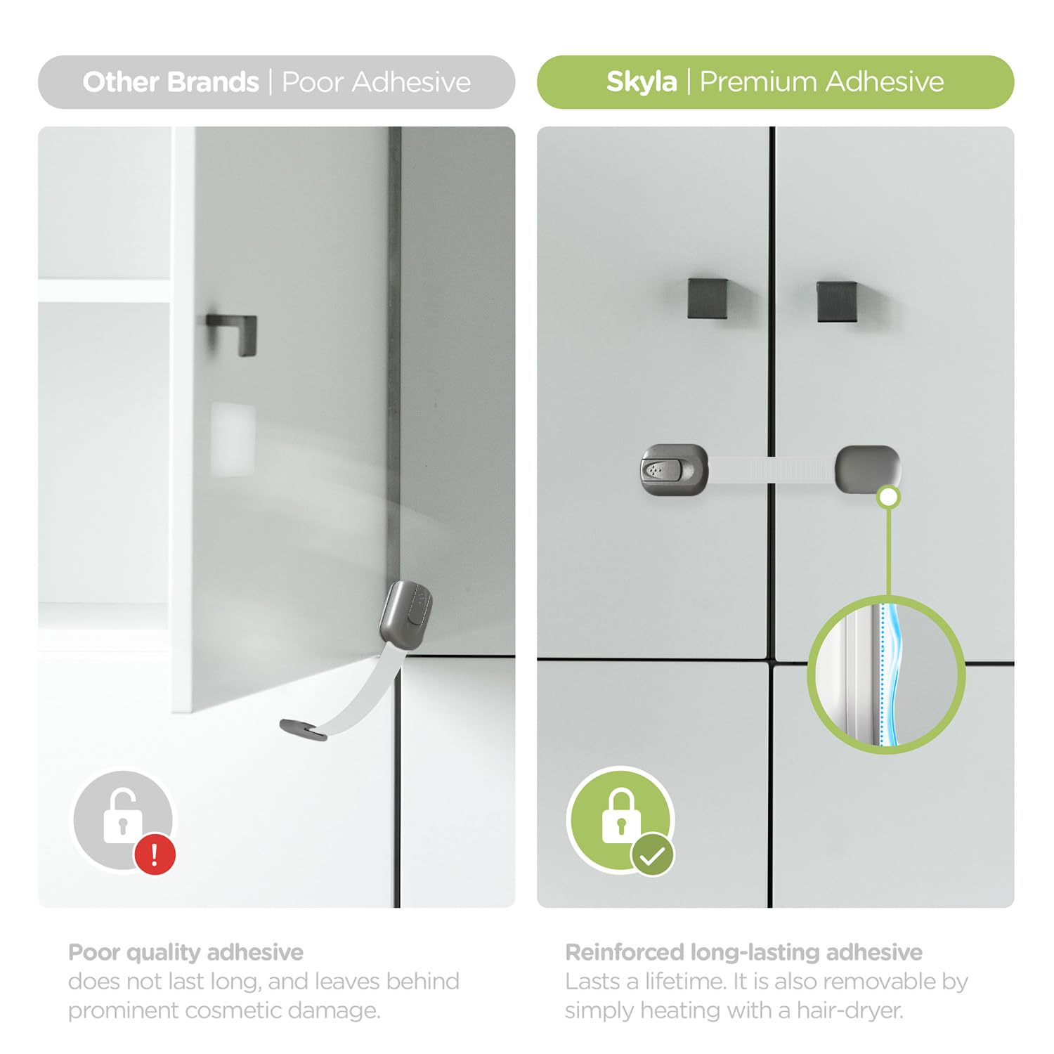 • What You Get: 2 multi-purpose cabinet locks that has a high grade 3M adhesive. Flexible strap means you can bend around items from toilet seats to fridges
