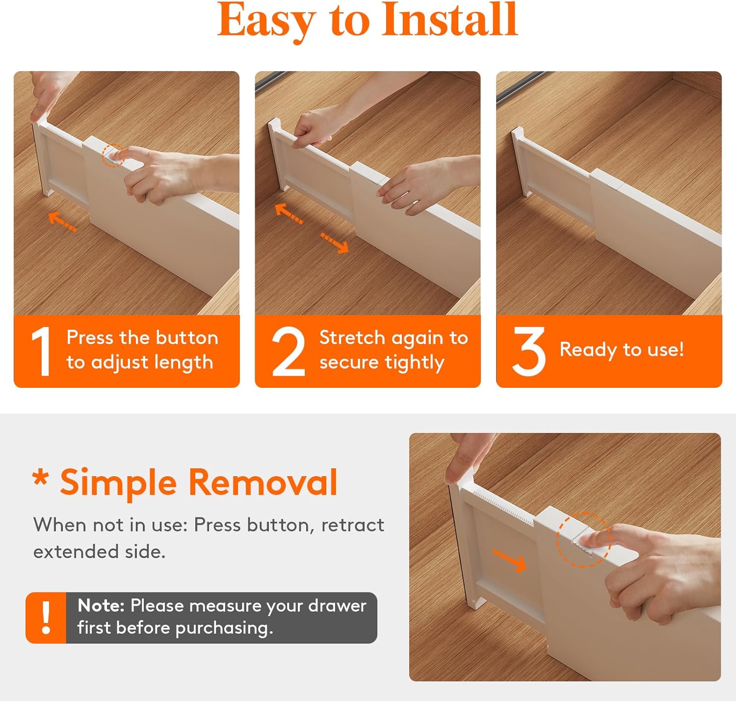 - Easy to Install: To adjust the length, press the top button before placing the drawer organizer, and then stretch it out again to secure it tightly. The strong spring tension keeps each organizer upright and secure. When retracting, press the top button and push in the stretched side.
