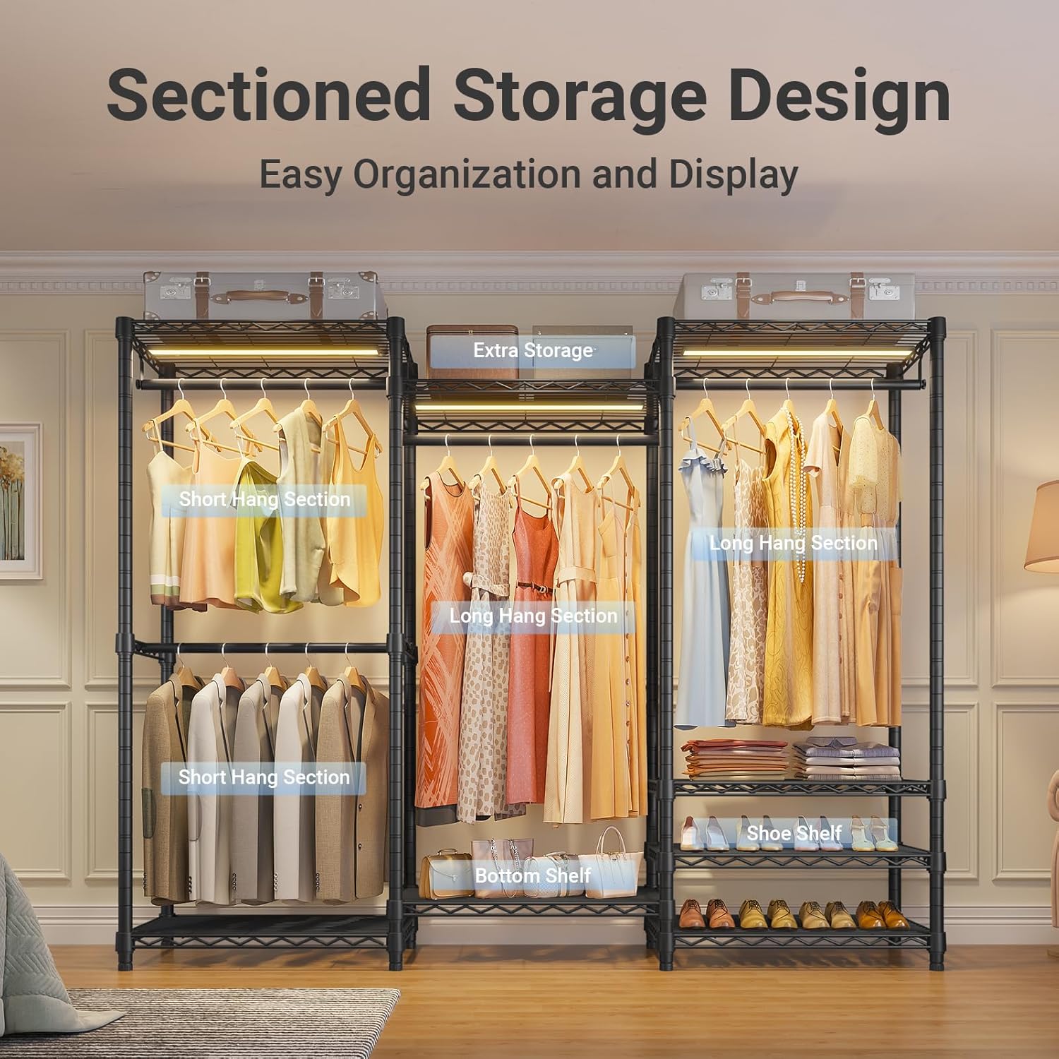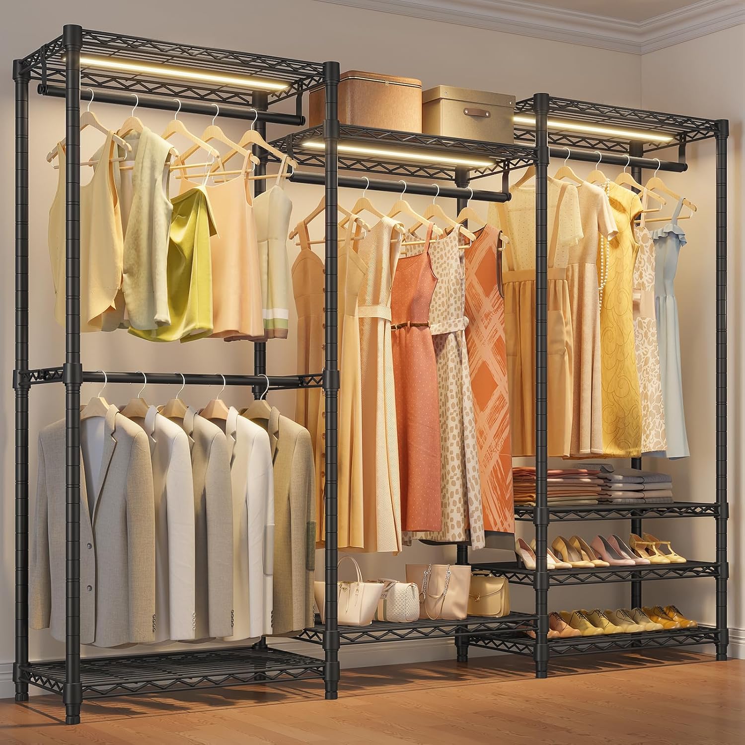 - Easy to Assemble: Our closet rack and lights are easy to assemble with clear instruction. Certain shelves must be installed in a particular order. Except for the manual, you can also refer to the installation video on the page.
