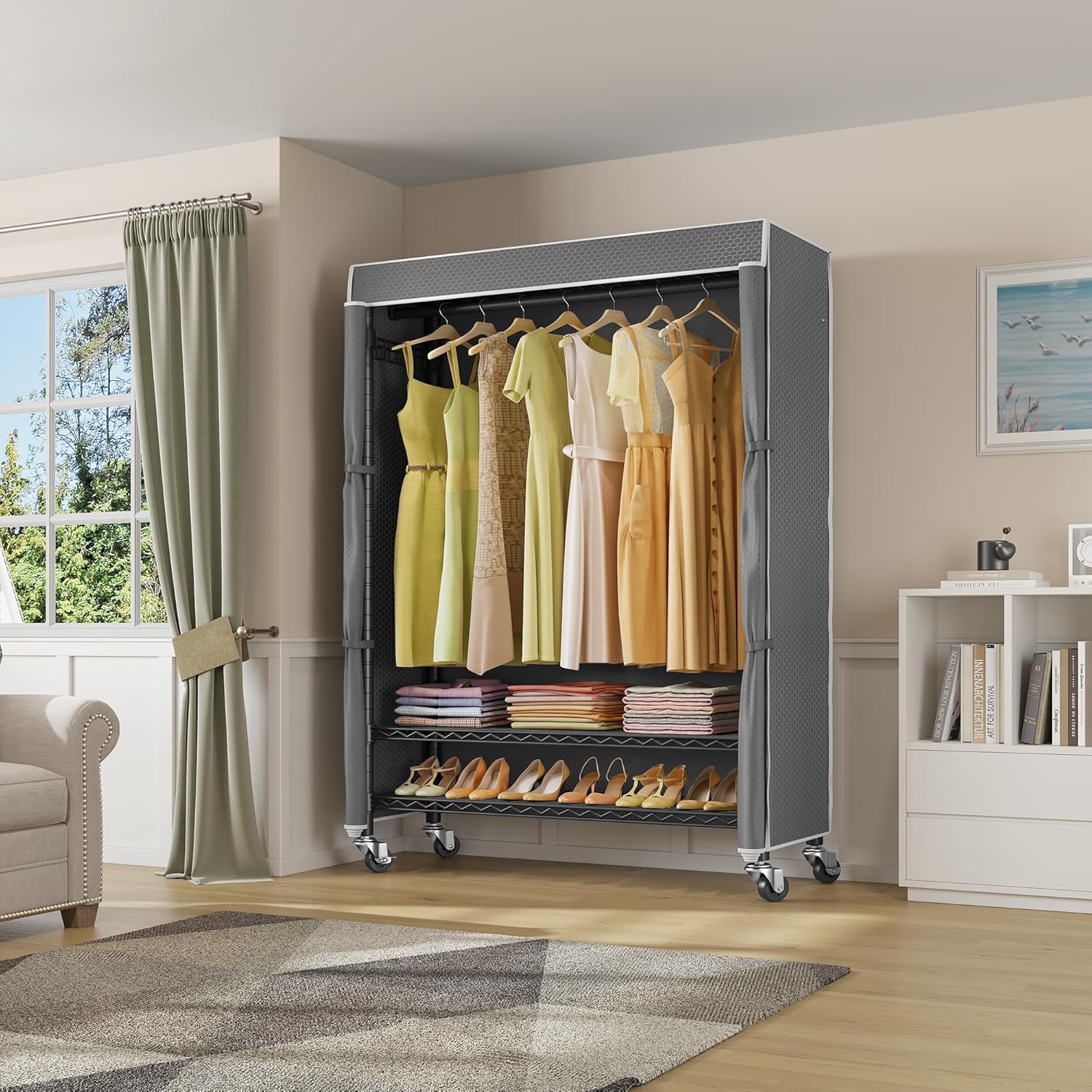 - 【Zippered Polyester Fabric Cover】Closet comes with upgraded polyester fabric cover, sturdy, wrinkle resistance, breathability keep garments dry. Easy to clean with damp cloth, and to keep your item away from dust.