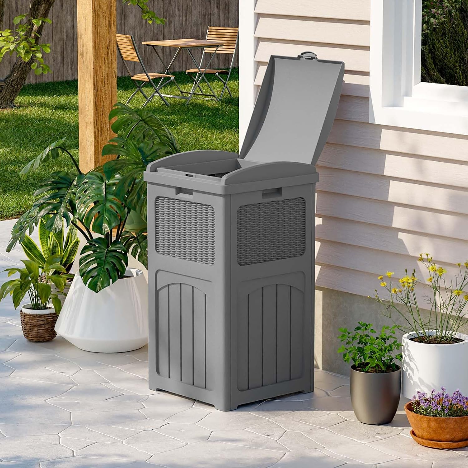 - Stylish appearance: With wicker design on the outside, it can be placed on any deck or patio, and can also be matched with other furniture.The wide range of colour variants gives you more options for integrating the bin into your home style.
