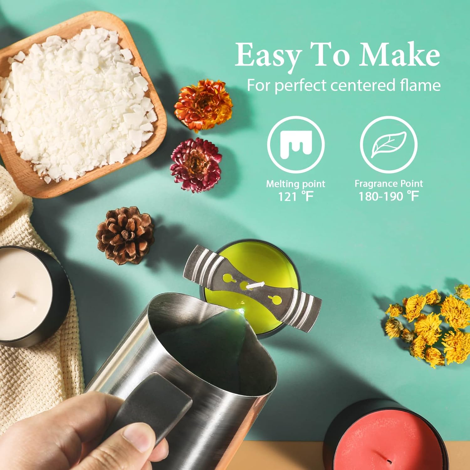 - 【CANDLE MAKING KIT】soy wax DIY kit includes all the essential materials to get you started crafting beautiful candles. 1x 10lb bag of natural soy wax (flake form) and 20x pre-cut candle wicks, 20 wick stickers and 2x centering devices.