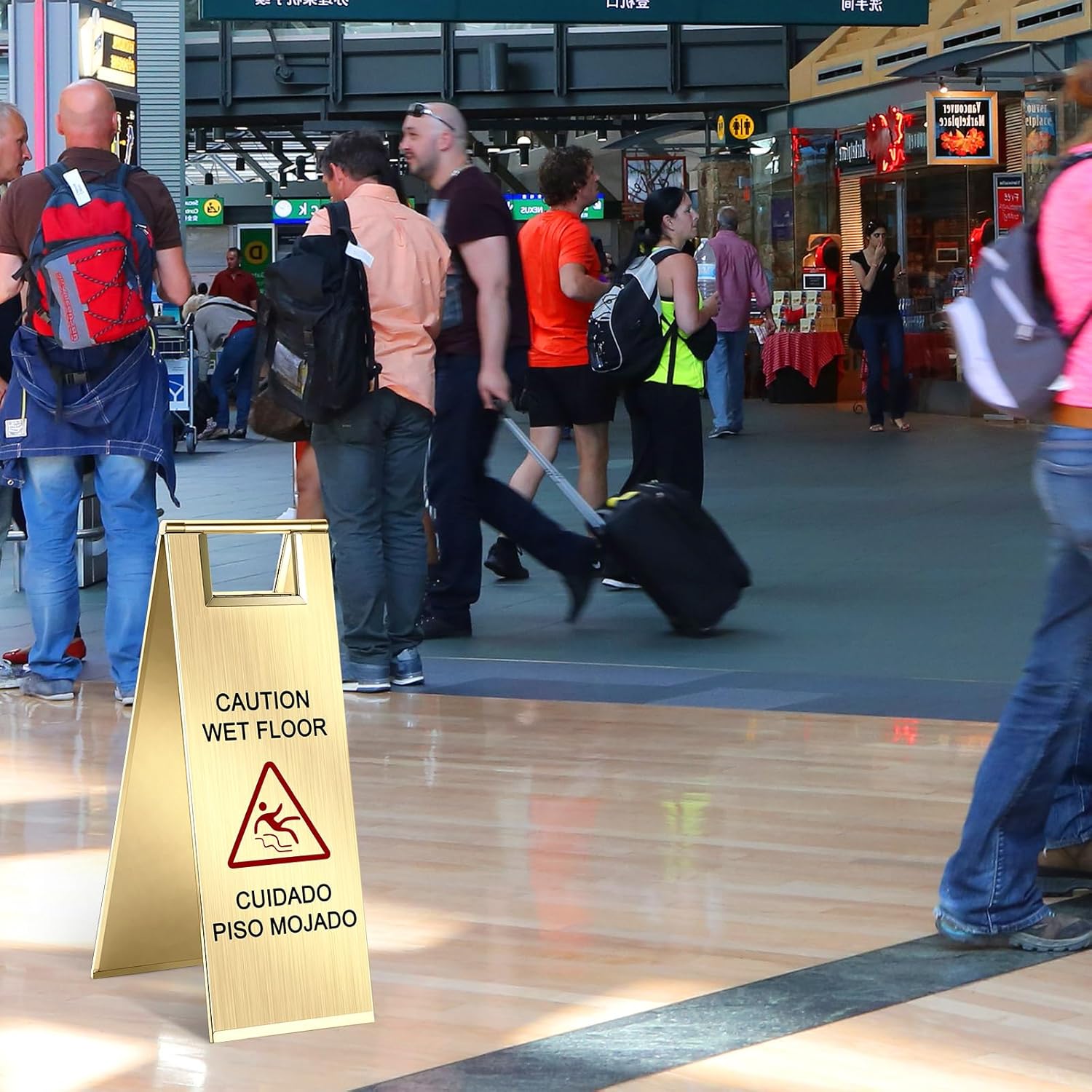 LEIFIDE 4 Pcs Stainless Steel Wet Floor Caution Sign Bulk 8.8 Pound Portable Foldable Handle Bilingual Safety Sign for Kitchen Restaurant Shop Commercial Use Avoid Fall and Slip Accident (Gold)