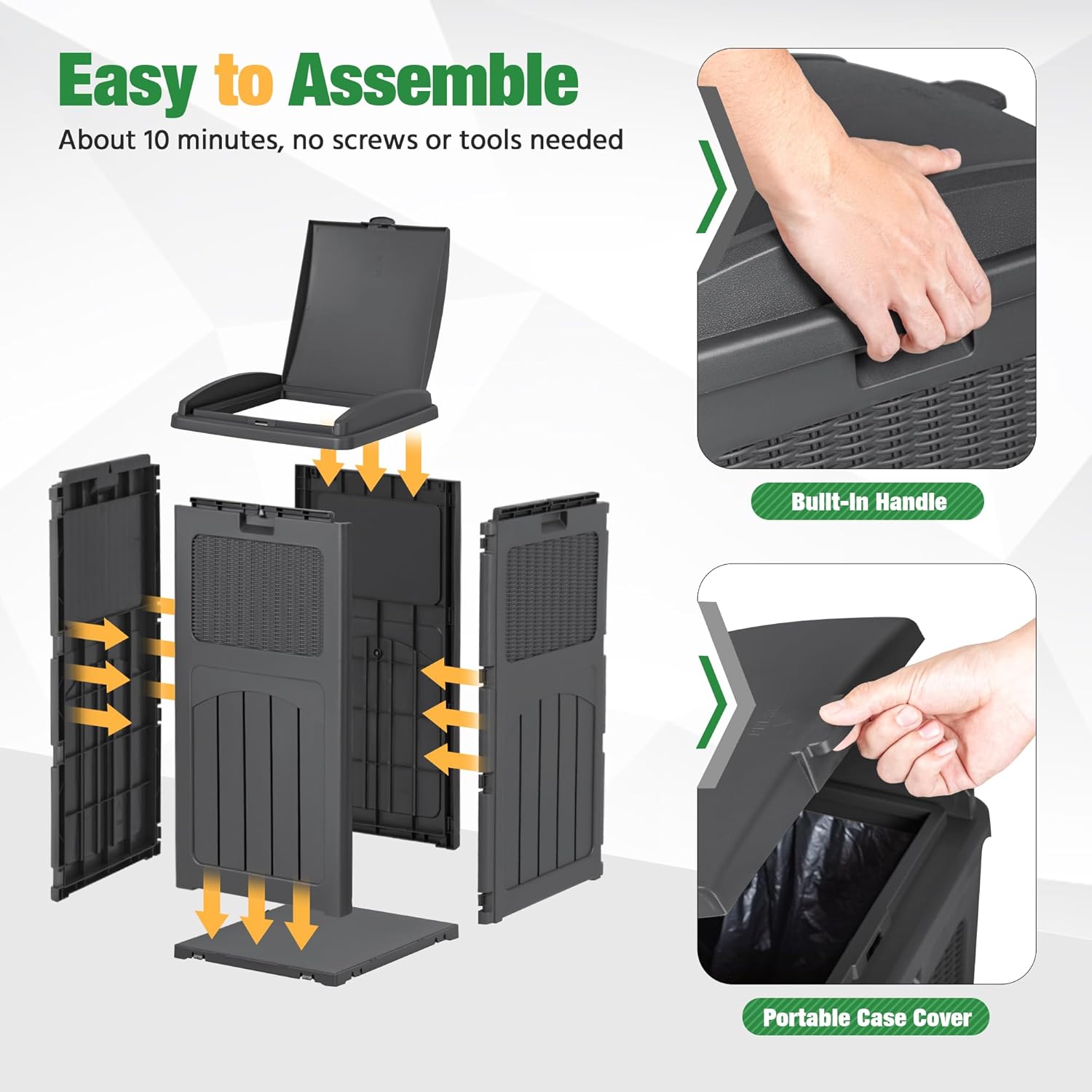- Easy to Install Trash Bags: The waste bin for outdoors is compatible with 30-33 gallon trash bags. You need to lift the trash bag holder, put on the trash bag, put down the holder, and then finish the installation. After opening the inner lid, the garbage bag can be stably fixed in the card slot.